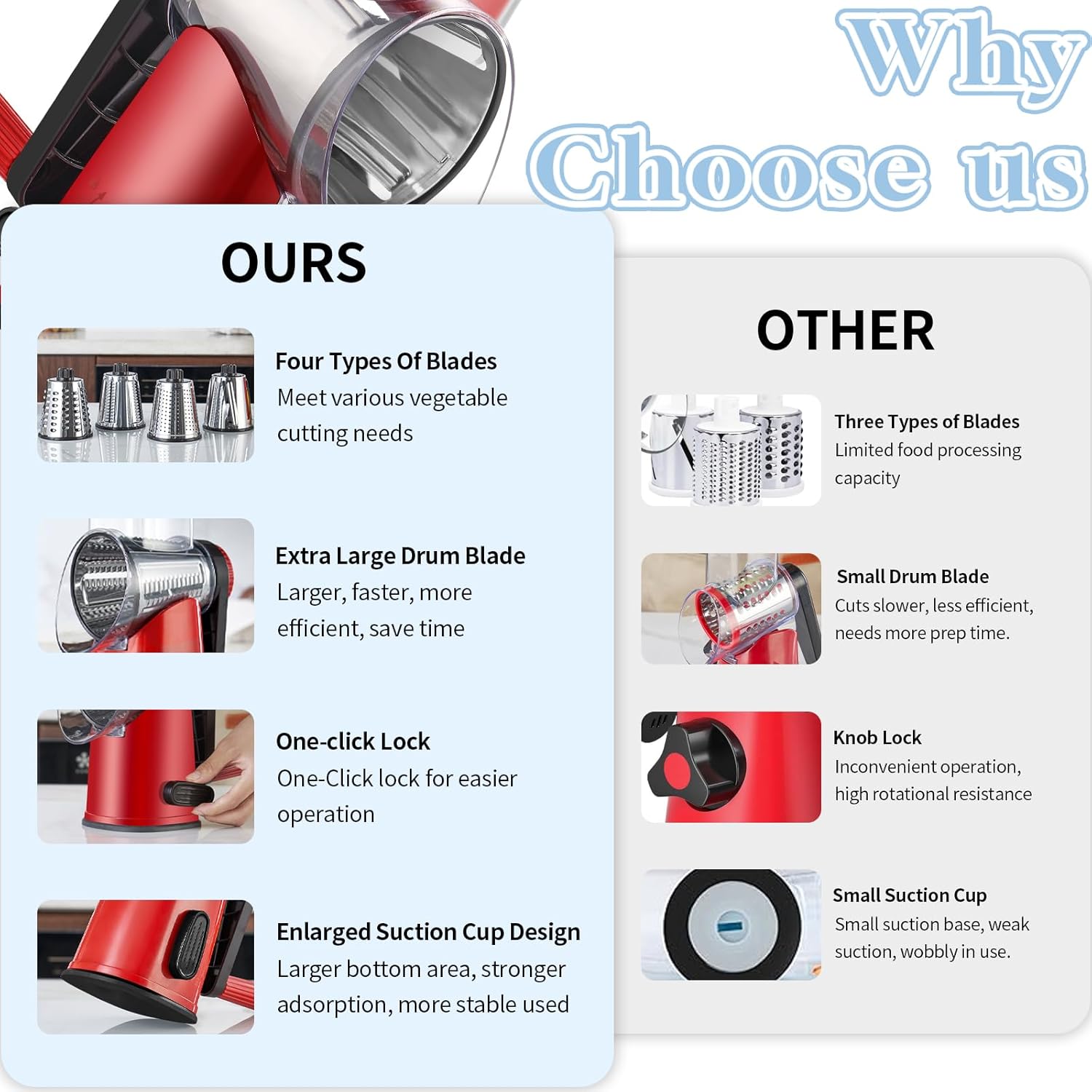 • Upgraded 4-in-1 Drums – Larger, Faster, More Efficient : Rotary cheese grater features 4 premium 430 stainless steel drums: slice, wavy slice, fine shred, and grind. Our extra-large cutting barrels process more food per turn—faster and more efficient than other grater. Ideal for prepping cheese, potatoes, zucchini, cucumbers, carrots, and more with ease.