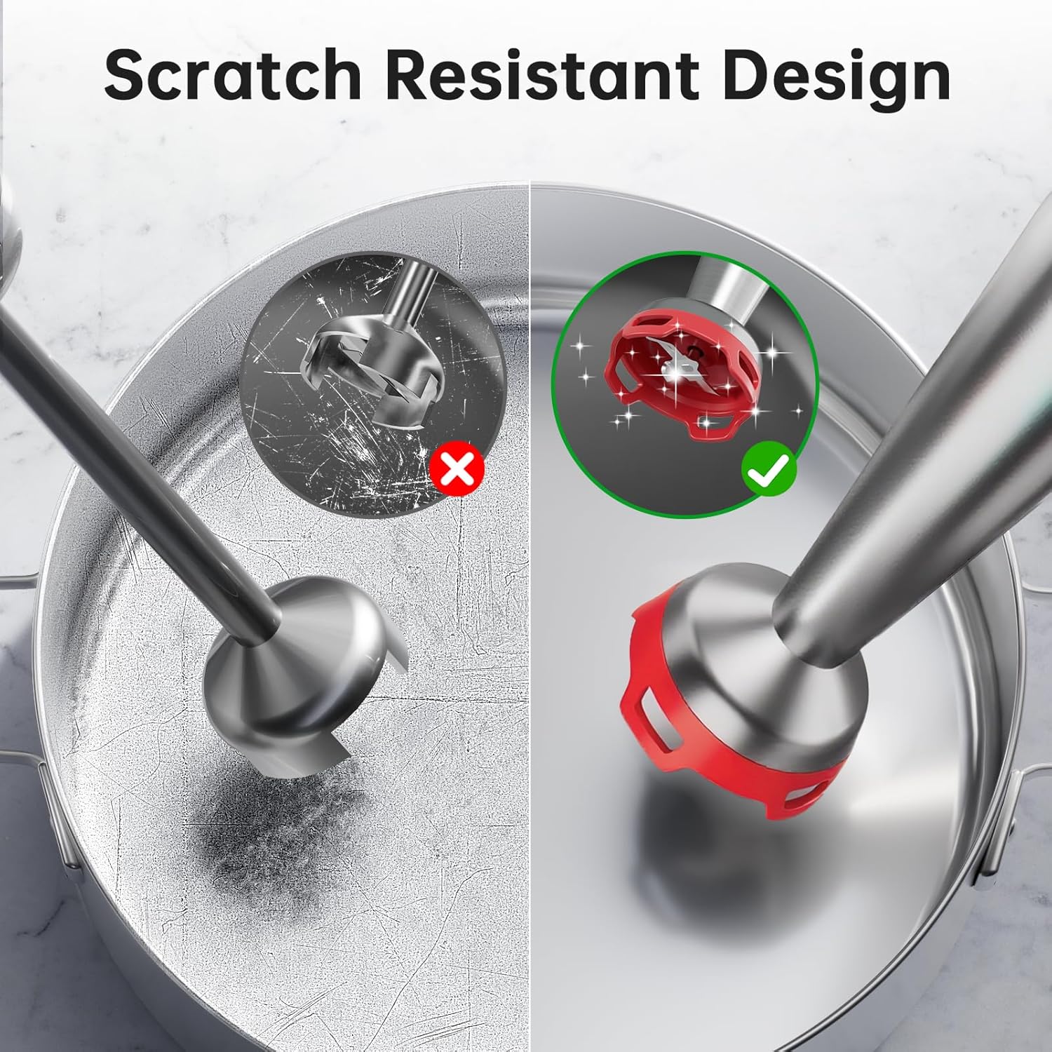 • Effortless Clean-Up, Scratch-Free: Features a unique food-grade nylon blade guard designed to minimize suction, preventing scratches on your pots and pans and keeping splashes at bay for a cleaner kitchen and hassle-free clean-up.