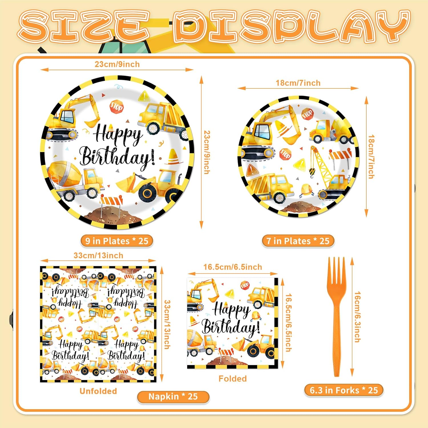 100 Pcs Construction Truck Party Tableware Set – Disposable Vehicle Theme Plates, Napkins, and Forks for Boys Birthday Parties and Truck-Themed Celebrations – Serves 25