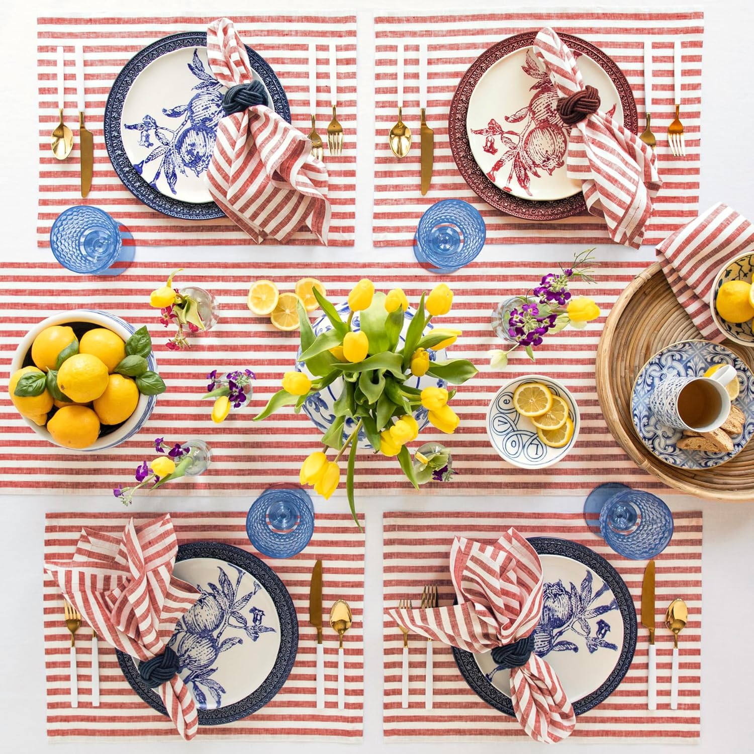 Solino Home Striped Linen Table Runner 144 Inches Long - Amalfi Stripe 100% Pure Linen Red and White Dining Table Runner 14 x 144 Inch