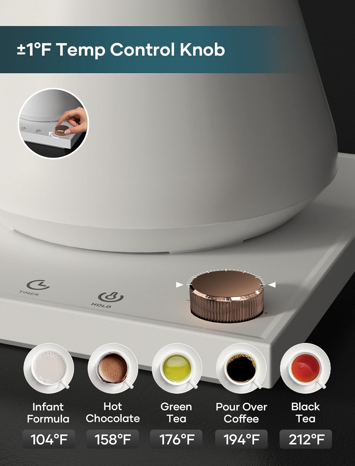 • ±1℉ Precise Temperature Control - The intelligent base of this electric kettle auto-adjusts heating power for pinpoint accuracy. From pour-over coffee at 205°F to green tea at 176°F, enjoy barista-quality flavor every time.