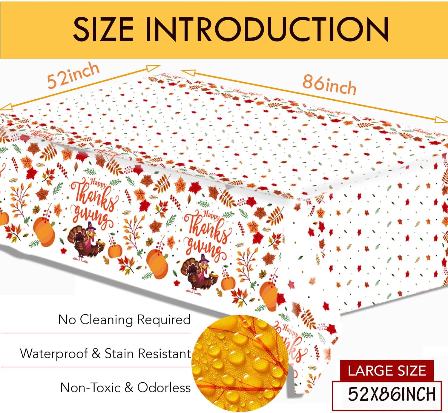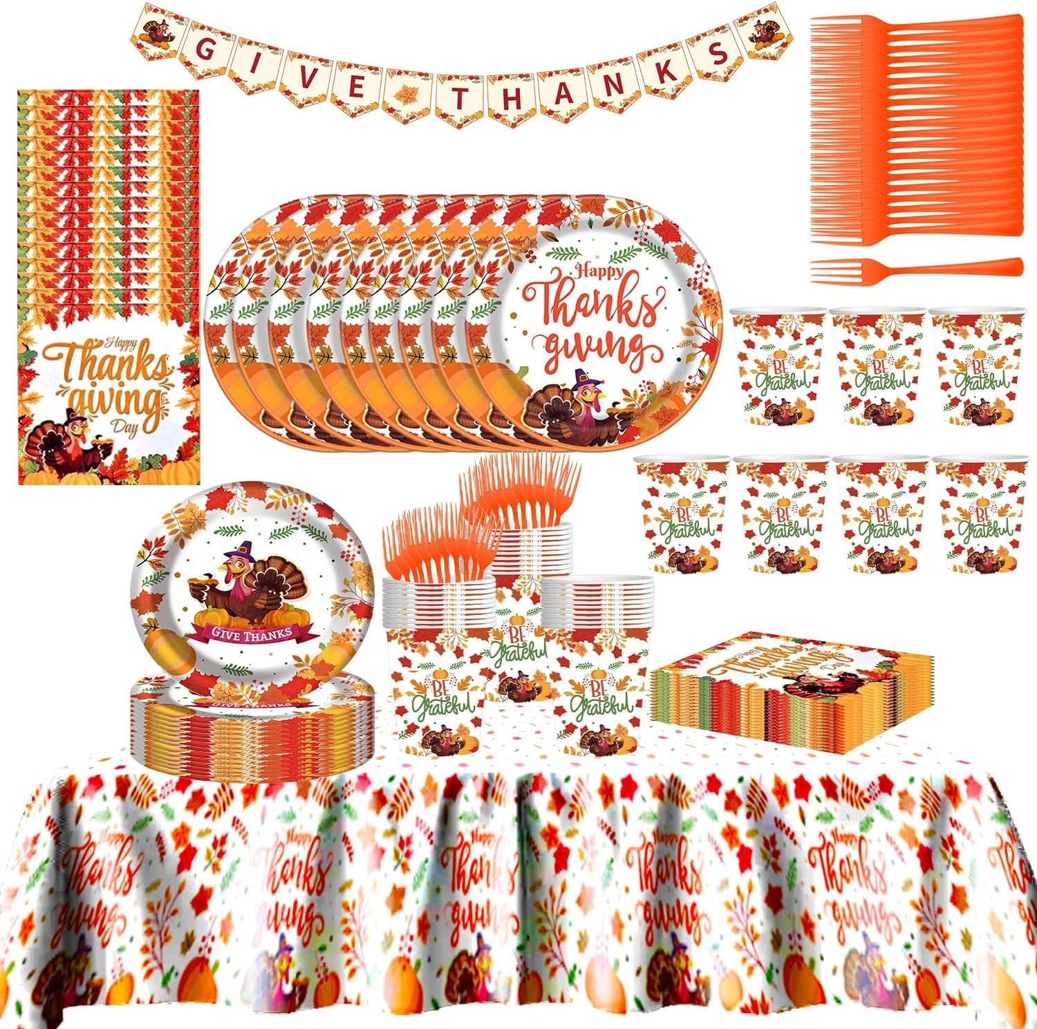 • ·2025 THANKSGIVING TURKEY PARTY SUPPLIES DINNERWARE SET: Includes 127 PCS for 25 Guest --25 x 9 inches disposable paper dinner plates, 25 x 7 inches compostable dessert plates, 25 x 9oz paper cups, 25 x 6.5”paper napkins,25 gold plastic forks, 1 pcs tablecolth and 1 pcs banner. Durable Party Supplies set allow you to serve 25 guests at one time.