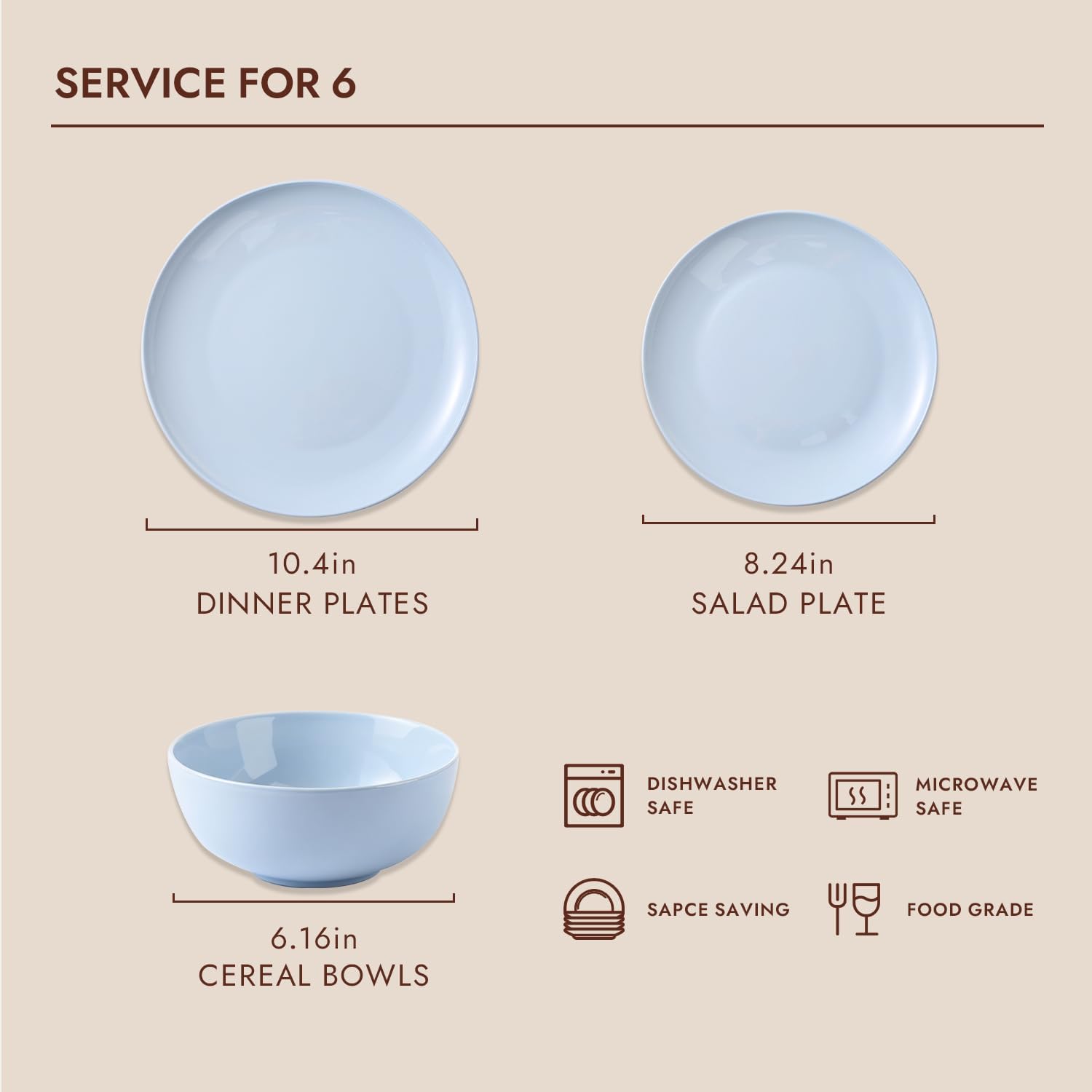 • 18-Piece Blue Dinnerware Sets: Includes (6) 10.24 inch dinner plates, (6) 8.24 inch salad plates and (6) 6.16 inch soup/cereal bowls. Whether you’re serving a simple brunch or a hearty dinner, these dinnerware sets have you covered.