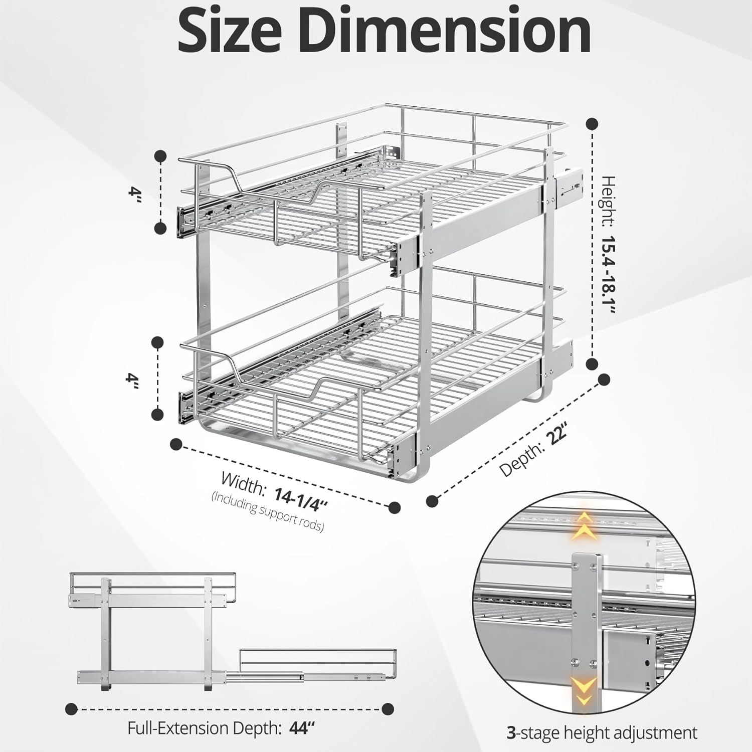 ZOINLIY Pull Out Cabinet Organizer, Versatile Slide Out Kitchen Organizers and Storage,Heavy Duty Drawer Cupboard Storage Basket, Smooth Sliding, Chrome Finish (2-Tiers-14¼''W×22“D)