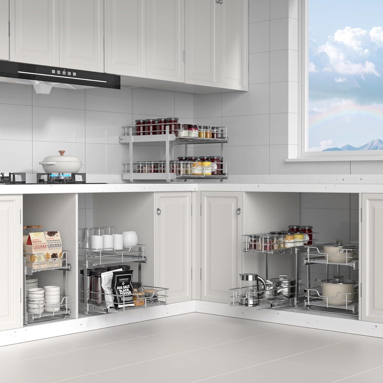 • 【Strong Load-Bearing】Constructed from durable chrome stainless steel, this kitchen cabinet organizer boasts a heavy gauge wire construction and full-extension ball-bearing system, ensuring smooth and reliable operation,no harsh metallic sounds ,while supporting weights of up to 100lb/45kg.