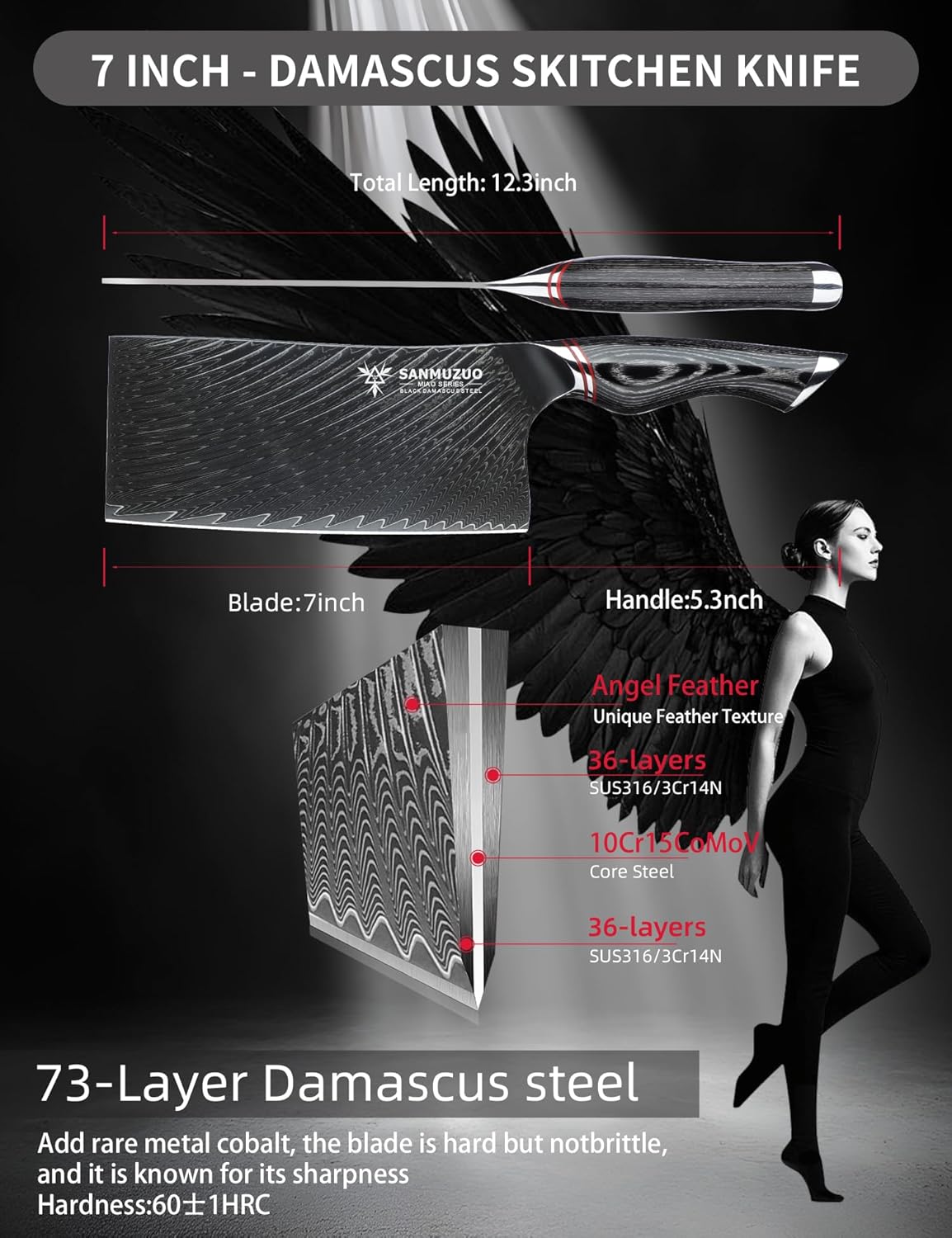 • Black forged 73-layer Damascus steel, cryogenically treated with liquid nitrogen, and featuring a 15° ultra-fine edge.