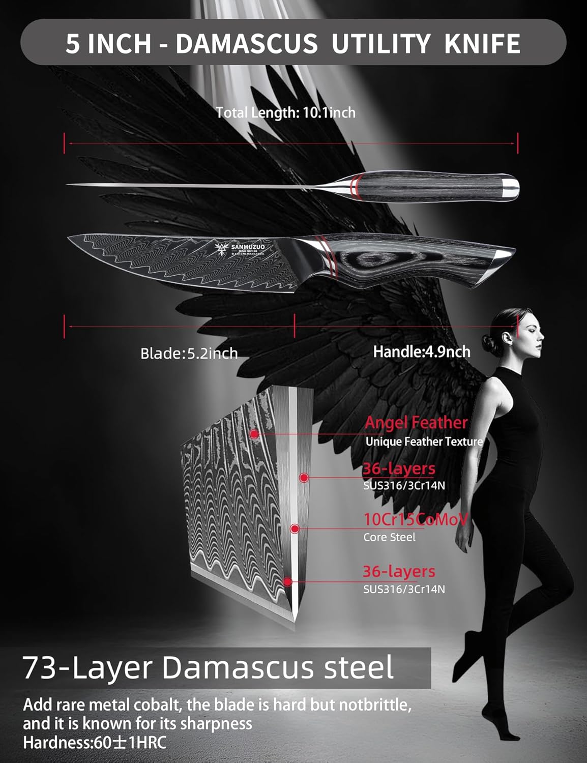 5 Inch Utility Knife - Fruit and Vegetable Knives, Black Damascus Steel with Ergonomic Handle - MIAO Series