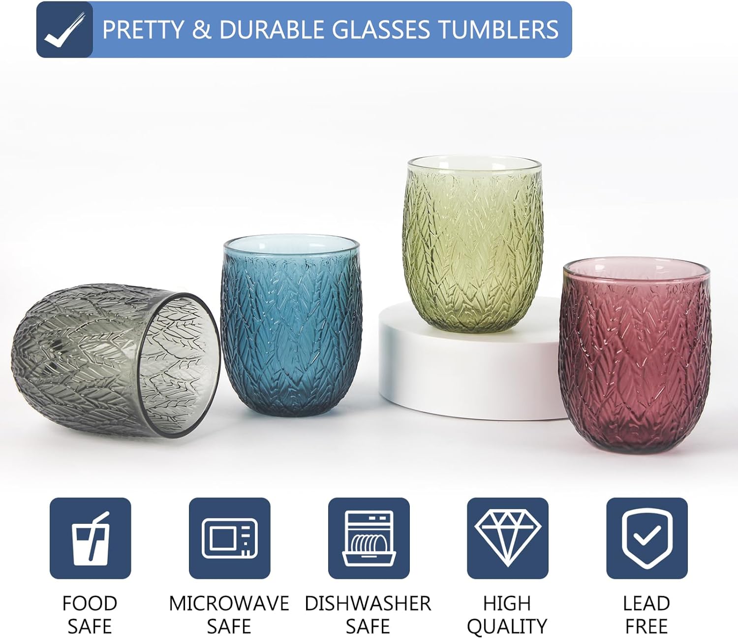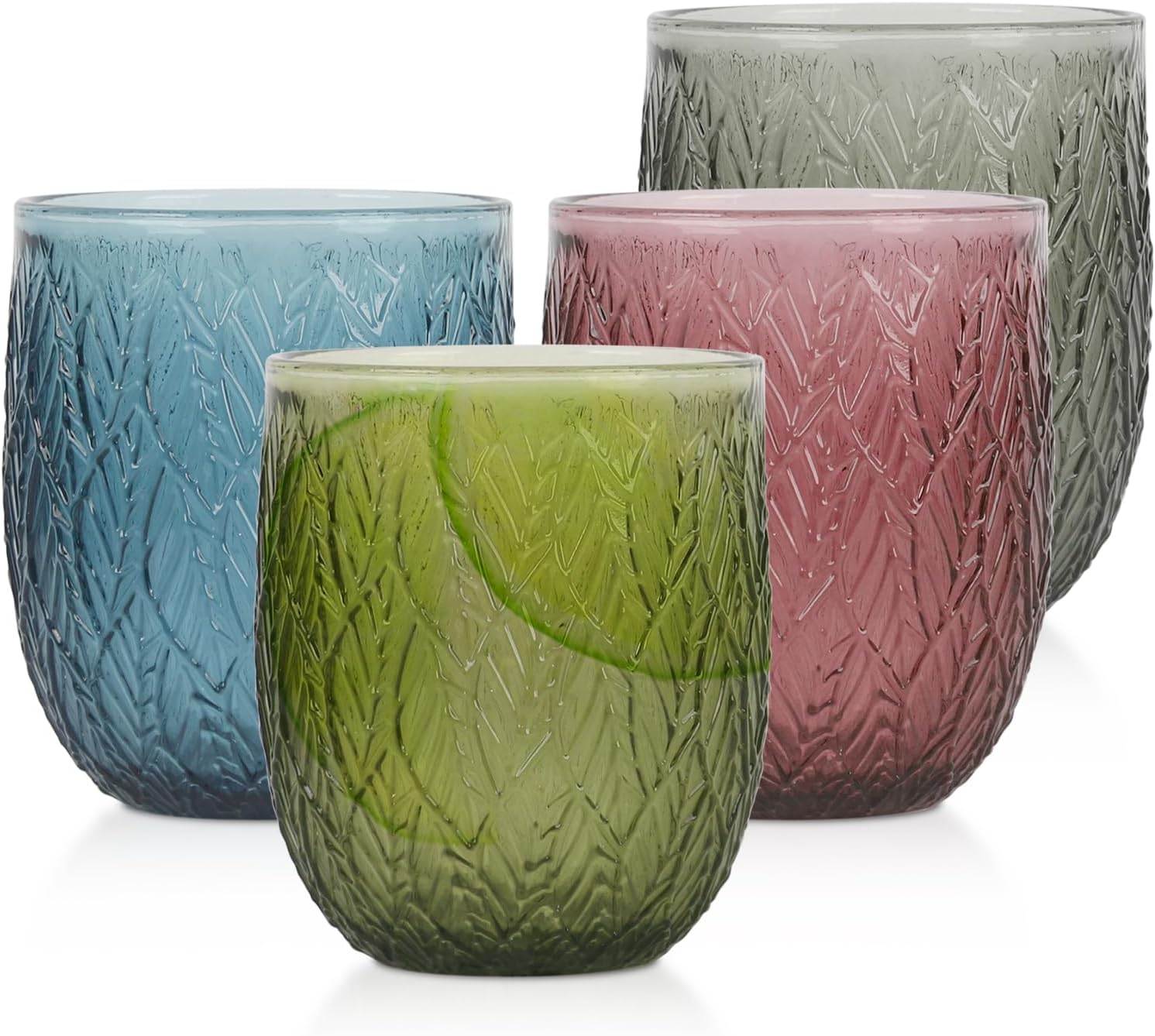 Colored Glasses Drinking Set of 4, 12oz Vintage Drinking Glasses, Drinking Glasses for Cocktail, Beer, Wine, Whiskey, Water & Juice Drinkware (Willow Leaf 4PCS)