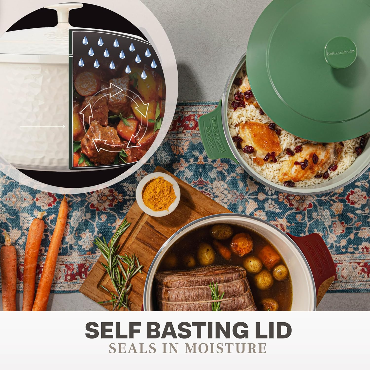 • SELF BASTING LID: Create deliciously, perfectly cooked, and memorable foods with the self-basting lid- The heavy lid allows for condensation and continuous redirection of moisture back into the pot, producing delicious meals by locking flavor and moisture inside your foods.