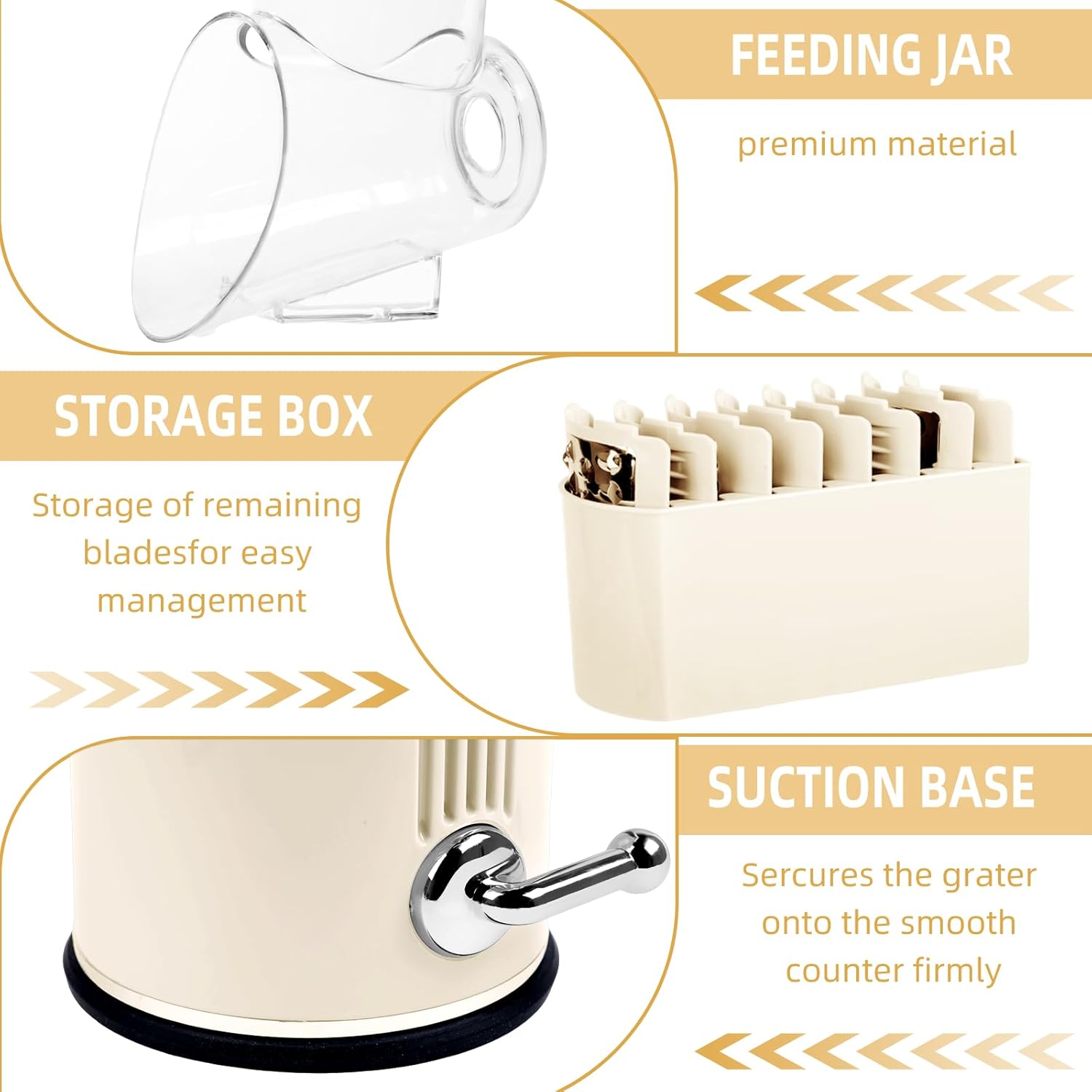 Rotary Cheese Grater with Handle, Vegetable Shredder with 5 Replaceable Blades & Strong Suction Base, Round Food Slicer & Chopper for Kitchen Fruit Vegetables Nuts with Blade Storage Box (White)