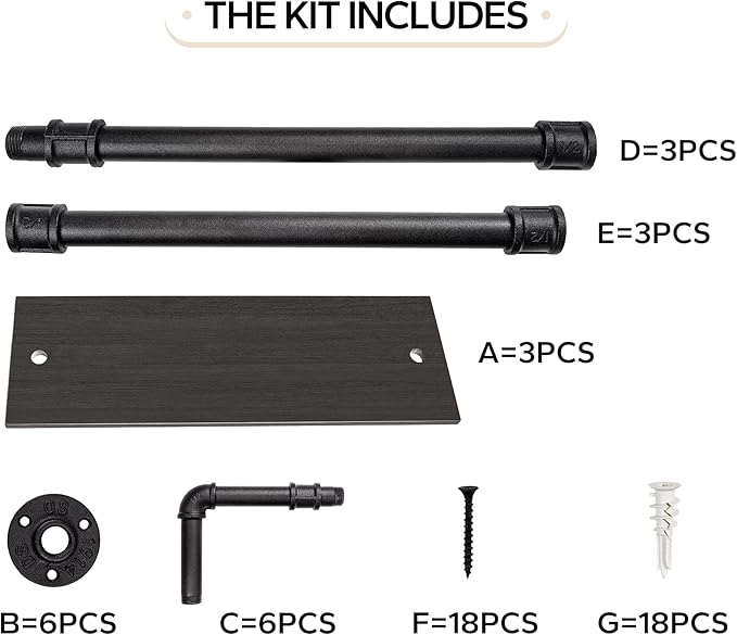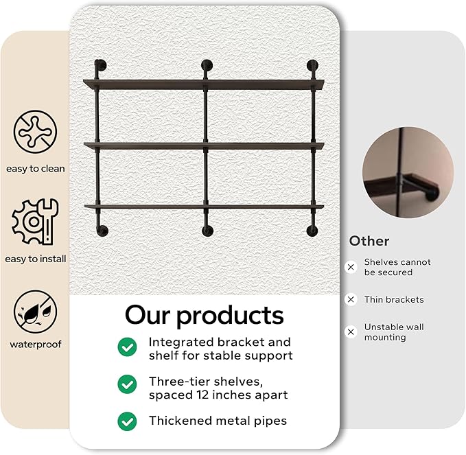 • Vintage Industrial Charm:Featuring a rustic industrial design, this floating shelf combines wooden boards with a distressed finish and iron pipes with a matte black finish for a vintage yet modern look. The anti-rust treatment on the metal ensures durability, making it suitable for both indoor and outdoor use.