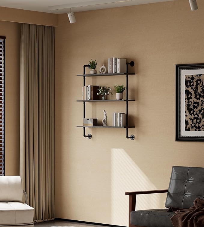 • Vintage Industrial Charm:Featuring a rustic industrial design, this floating shelf combines wooden boards with a distressed finish and iron pipes with a matte black finish for a vintage yet modern look. The anti-rust treatment on the metal ensures durability, making it suitable for both indoor and outdoor use.