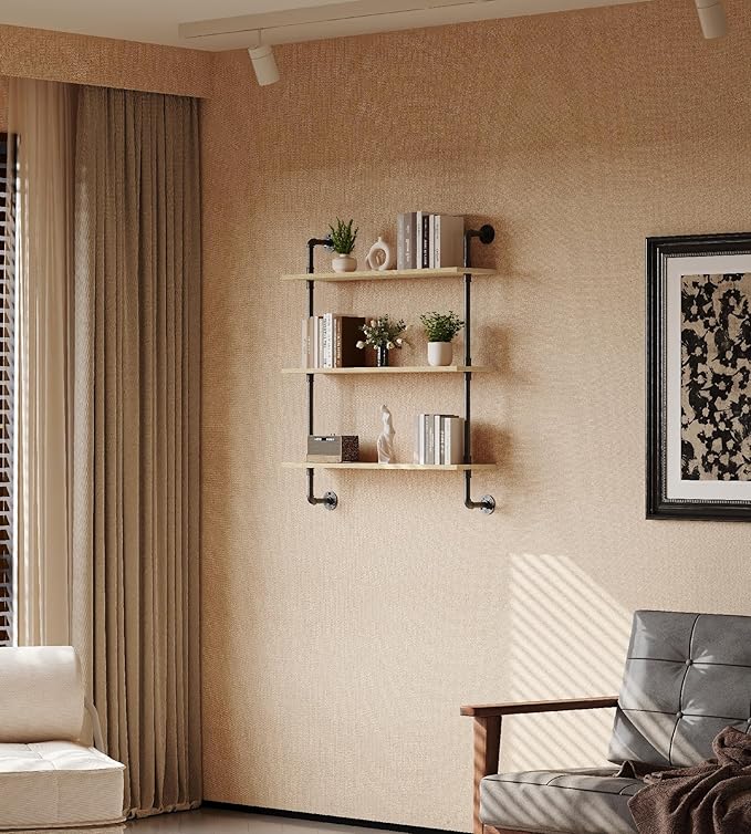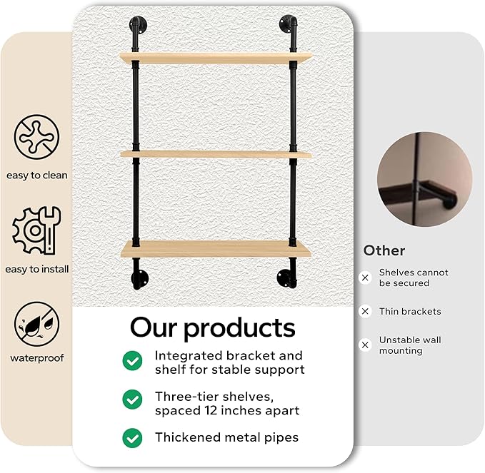 • Vintage Industrial Charm:Featuring a rustic industrial design, this floating shelf combines wooden boards with a distressed finish and iron pipes with a matte black finish for a vintage yet modern look. The anti-rust treatment on the metal ensures durability, making it suitable for both indoor and outdoor use.