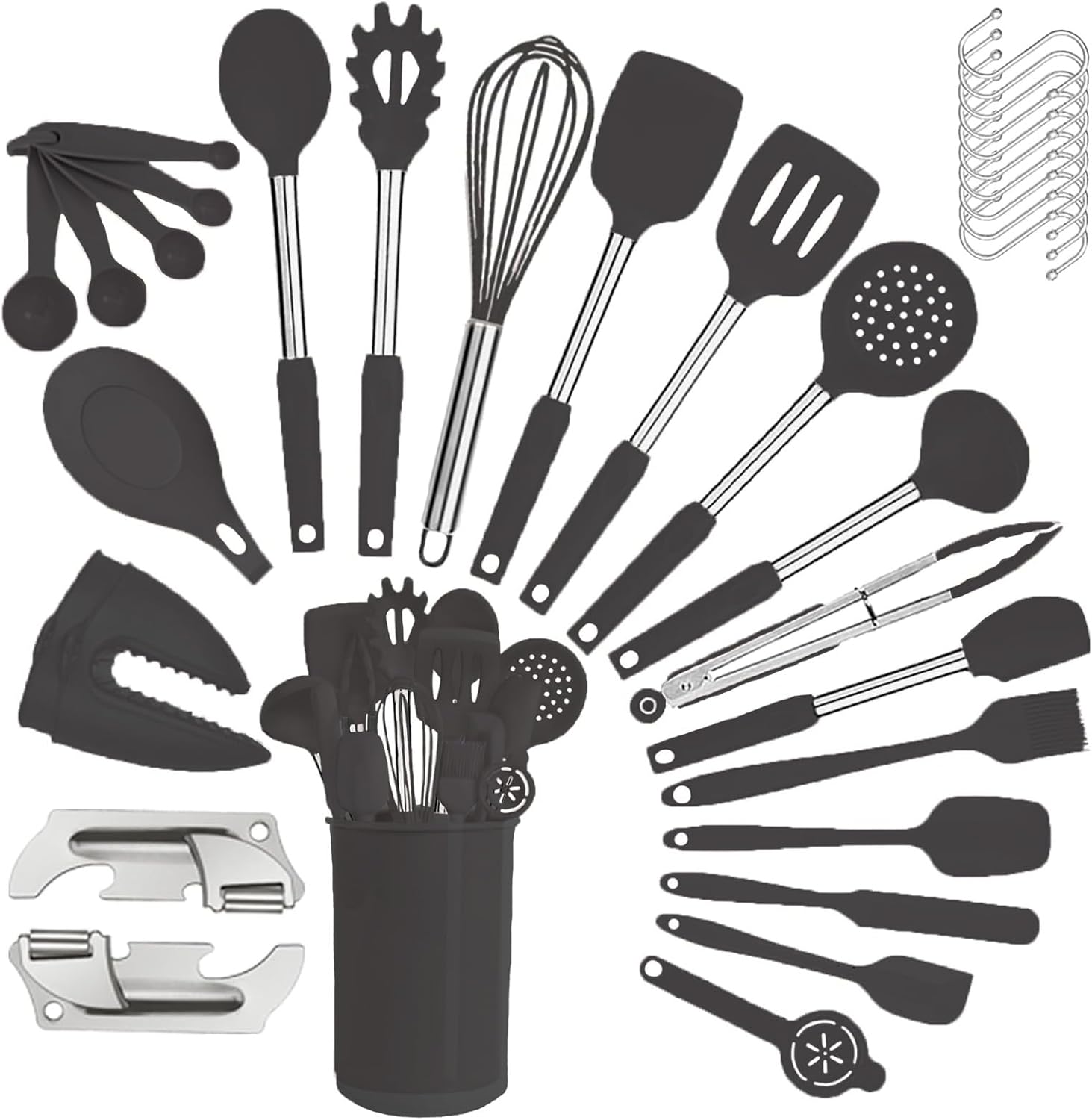 Silicone Kitchen Cooking Utensils Set with Stainless Steel Handle, Spatula Set Utensil Set, Cooking Utensil Set,Kitchen Tools Gadgets for Nonstick Cookware (35, Black)