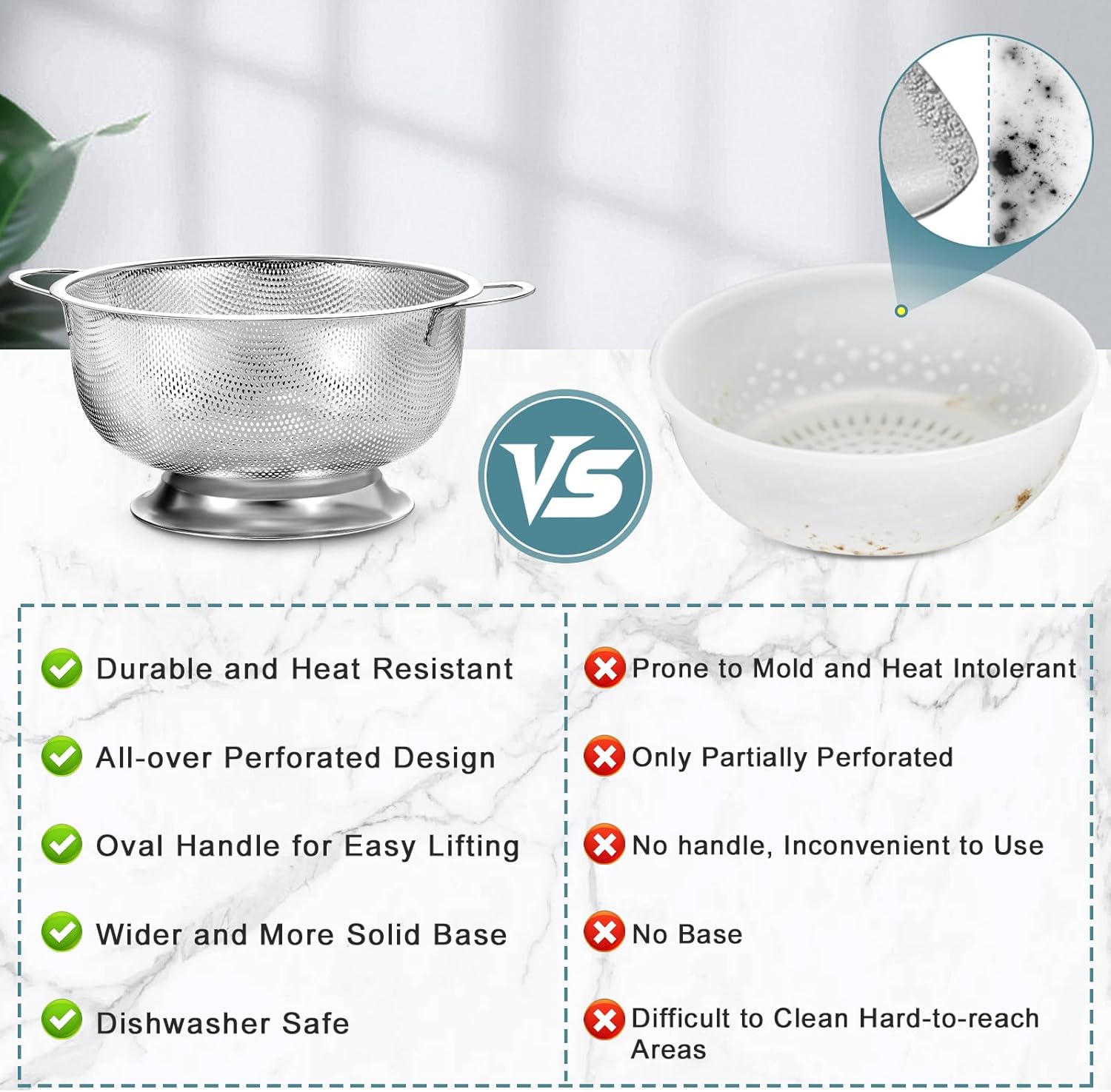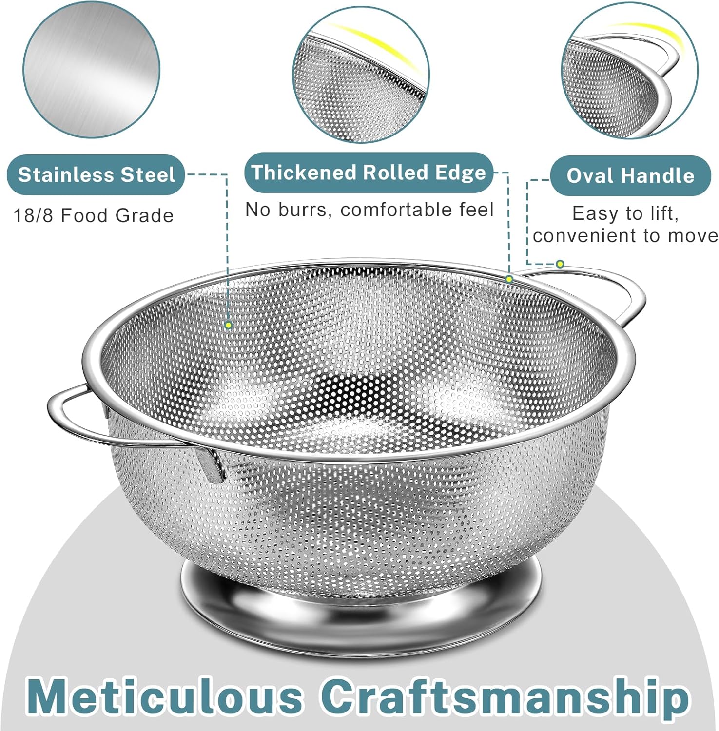 • 【Solid Base: Stable & Tip-Proof, Even When Full】Our colander set features a reinforced wide base that keeps the metal colander stable even when full. The sturdy base sits firmly in your sink or on the countertop, so you can focus on pouring, stirring or multitasking without constant worry of tipping. Whether you’re draining a pot of potatoes for a big Sunday roast or a batch of quinoa for meal prep, this base ensures your colander for kitchen stays exactly where you put it. No more messes, no more wasted food—just reliable stability every time
