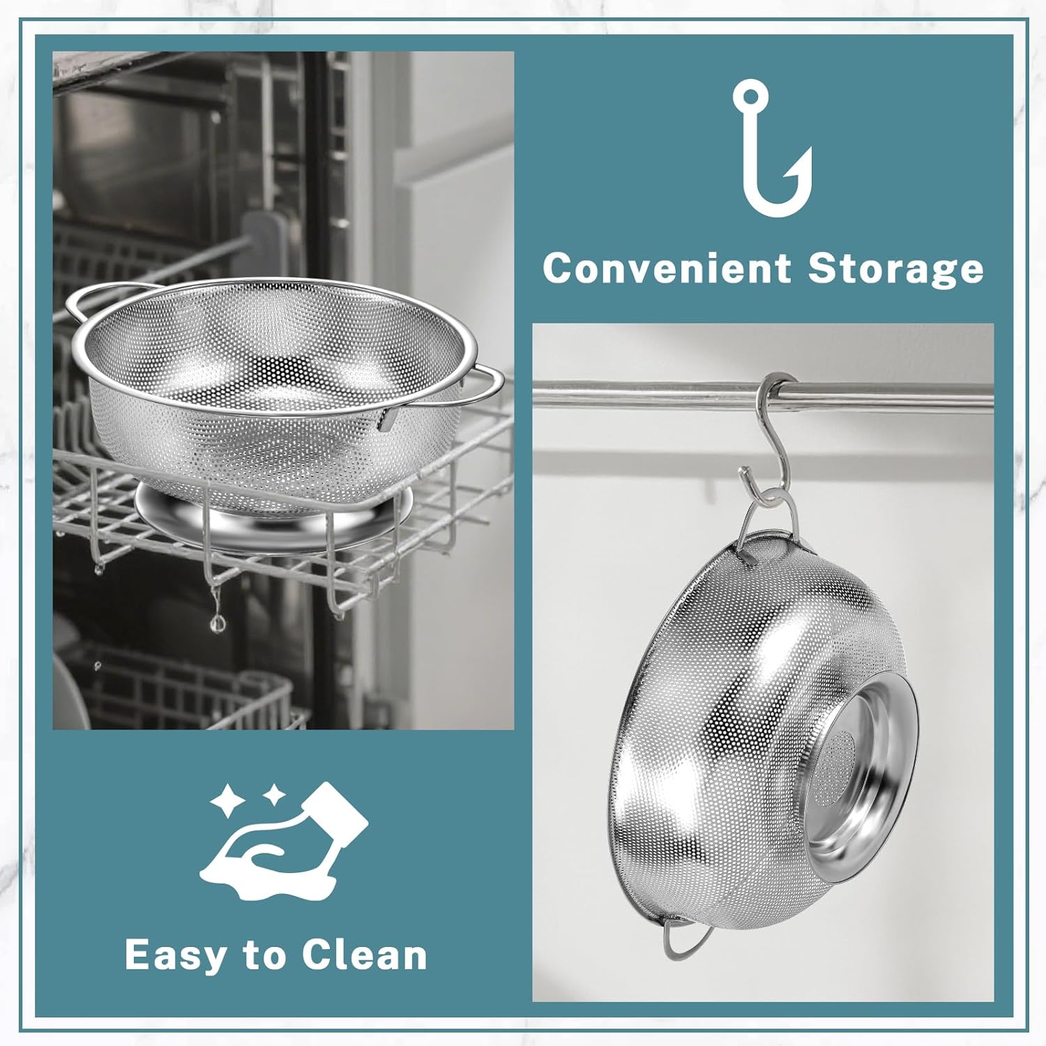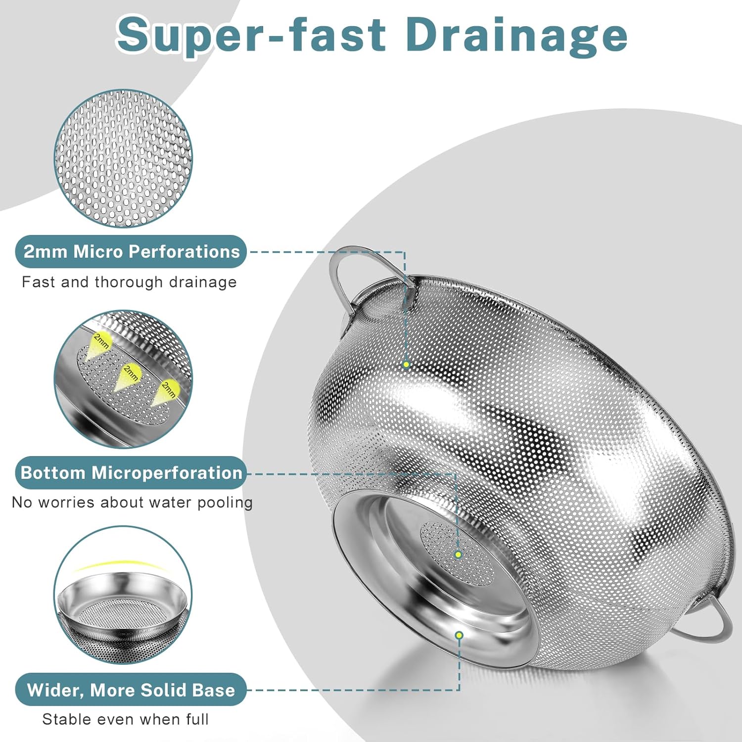 • 【2mm Micro-Perforations: Fast Draining, No Lost Foods】 Our pasta strainer and rice strainer feature precision 2mm micro-perforations. These tiny, evenly spaced holes let water rush out in seconds, cutting down on draining time. And because the holes are small enough to trap even quinoa or orzo, you’ll never have to fish stray grains out of the sink again. Whether you’re straining a pot of spaghetti or washing a pint of blueberries, the efficient drainage keeps your food where it belongs—inside the strainers and colanders, not down the drain