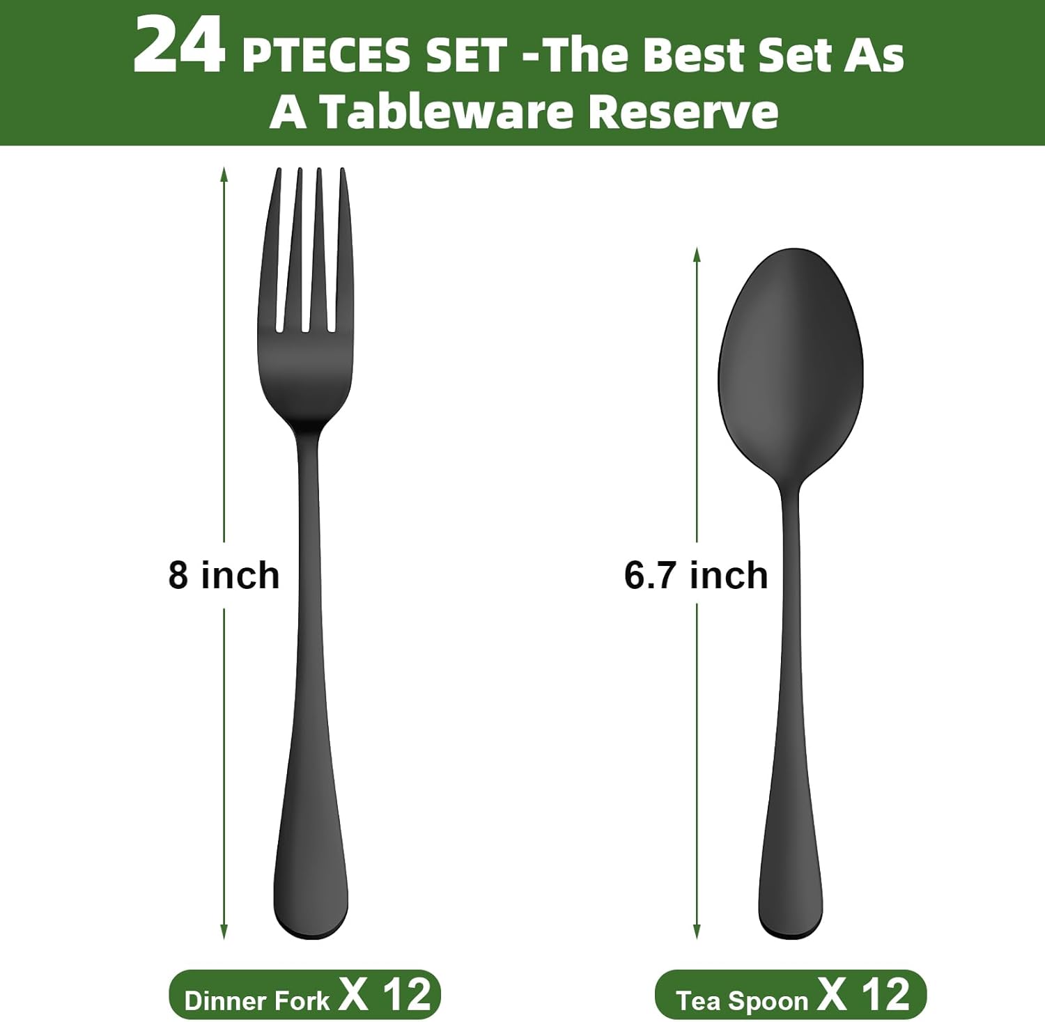 24 Pcs Black Forks and Spoons Silverware Set, Food Grade Stainless Steel Flatware Cutlery Set for Kitchen and Restaurant, 12 Dinner Fork(8") and 12 Teaspoon(6.7"), Mirror Polished, Dishwasher Safe