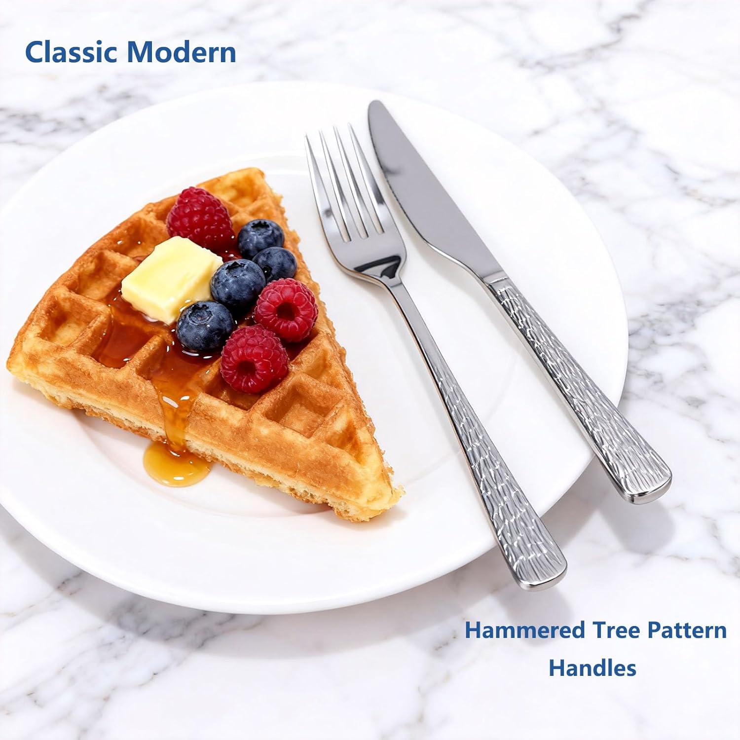 • Elegant Design with Mirror Polishing: Crafted in a timeless style, this utensil sets showcase refined silhouettes and graceful curves, making it an ideal match for any flatware collection. Each piece handle features a beautifully textured tree pattern hammered design, giving your tableware a luxurious yet earthy aesthetic. The mirror polished surface catches the light beautifully, elevating everyday meals or formal gatherings