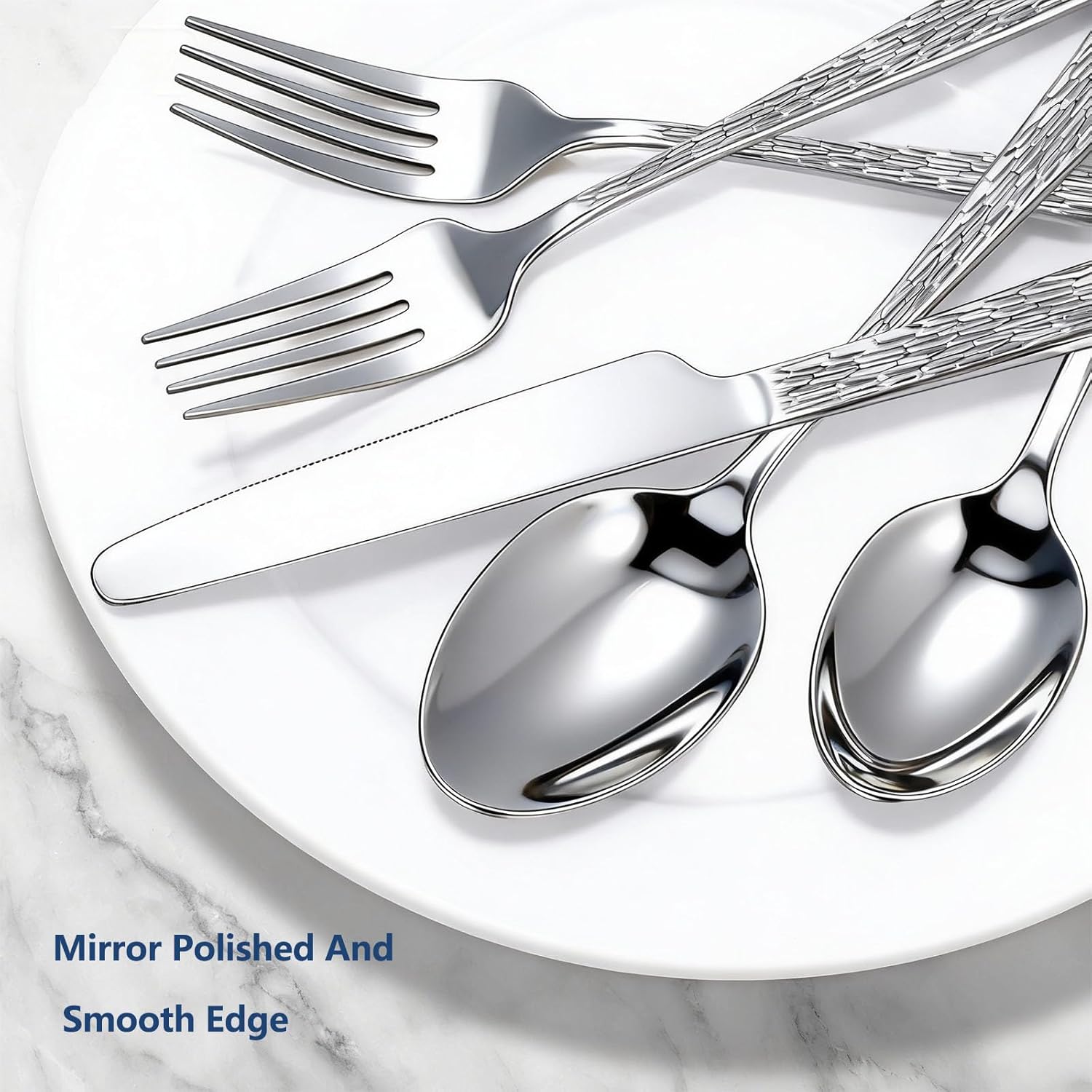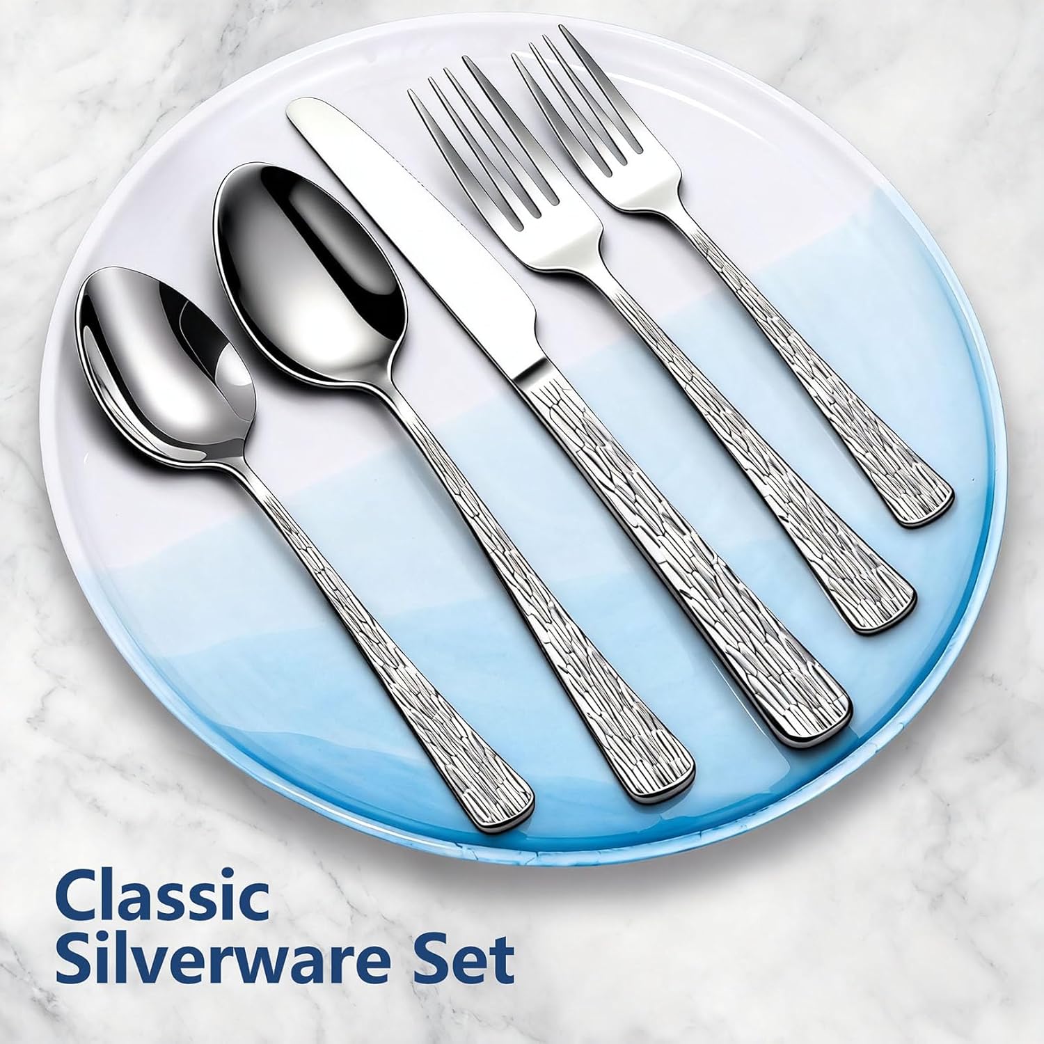 • 60-Piece Hammered Silverware Set for 12: Complete Dining Solution! This complete cutlery set include 12 dinner spoons,12 dinner forks,12 dinner knives,12 salad dessert forks,12 teaspoons. It is the ideal tableware set for your apartment, kitchen, and hotel. No more mismatched utensils--enjoy a cohesive, stylish table setting every time!
