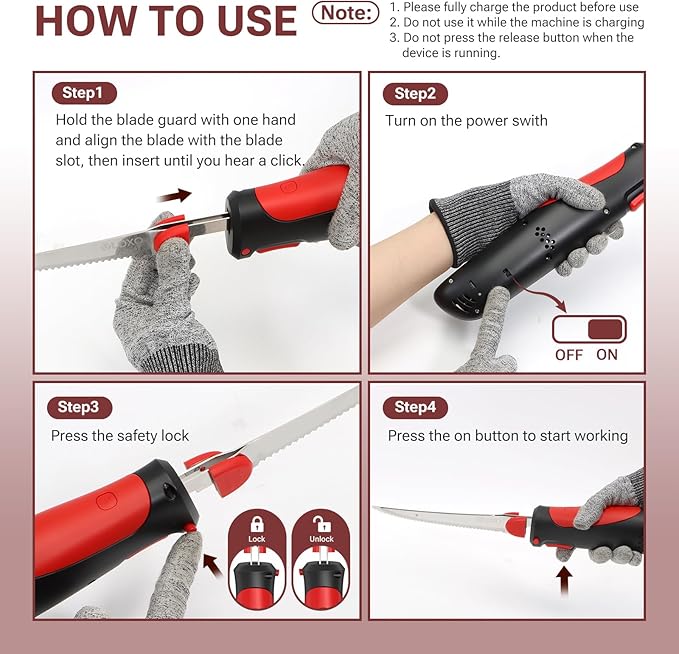 • Dual Safety Protection: The cordless electric knife features a unique dual-protection design. It only operates when both the power button and safety lock are engaged, enhancing safety and preventing accidental activation. This ensures a safe and controlled cutting experience every time.