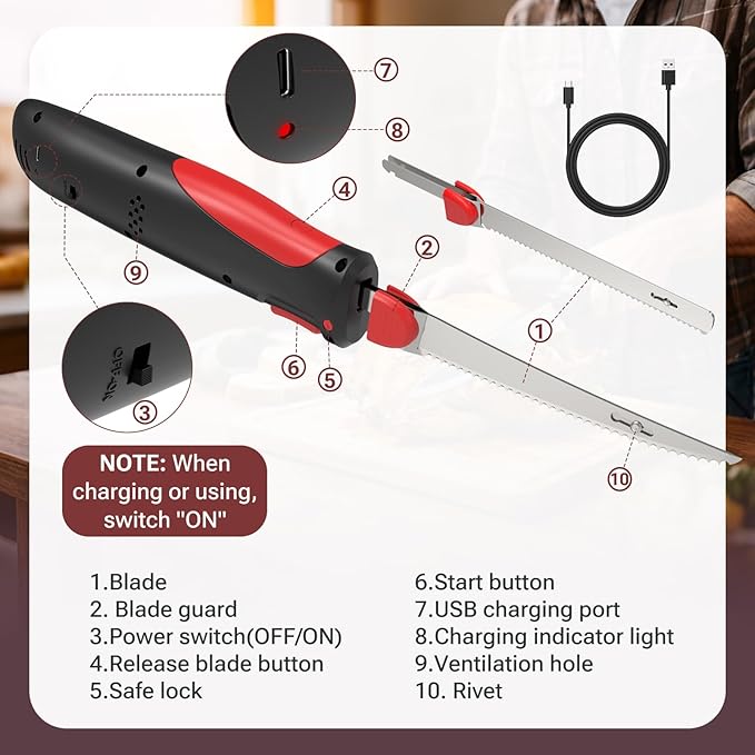 • Cordless & Rechargeable: This electric bread knife features a dual-oscillating blade design that cuts meat 50% faster than traditional knives. It's USB-rechargeable, eliminating the hassle of tangled cords and allowing you to chop and slice meat anytime, anywhere. It's perfect for busy hosts and family gatherings. Tip: When charge or use, please switch the power supply to "ON" position