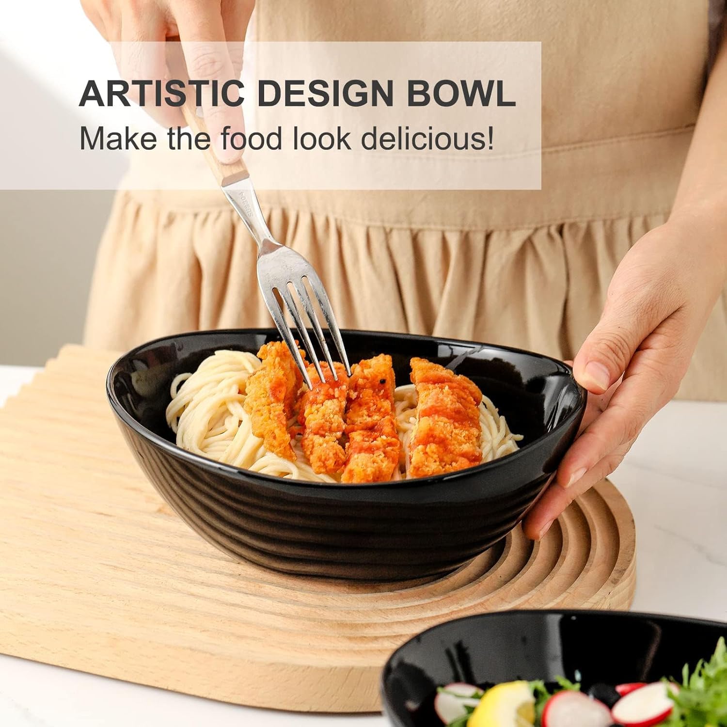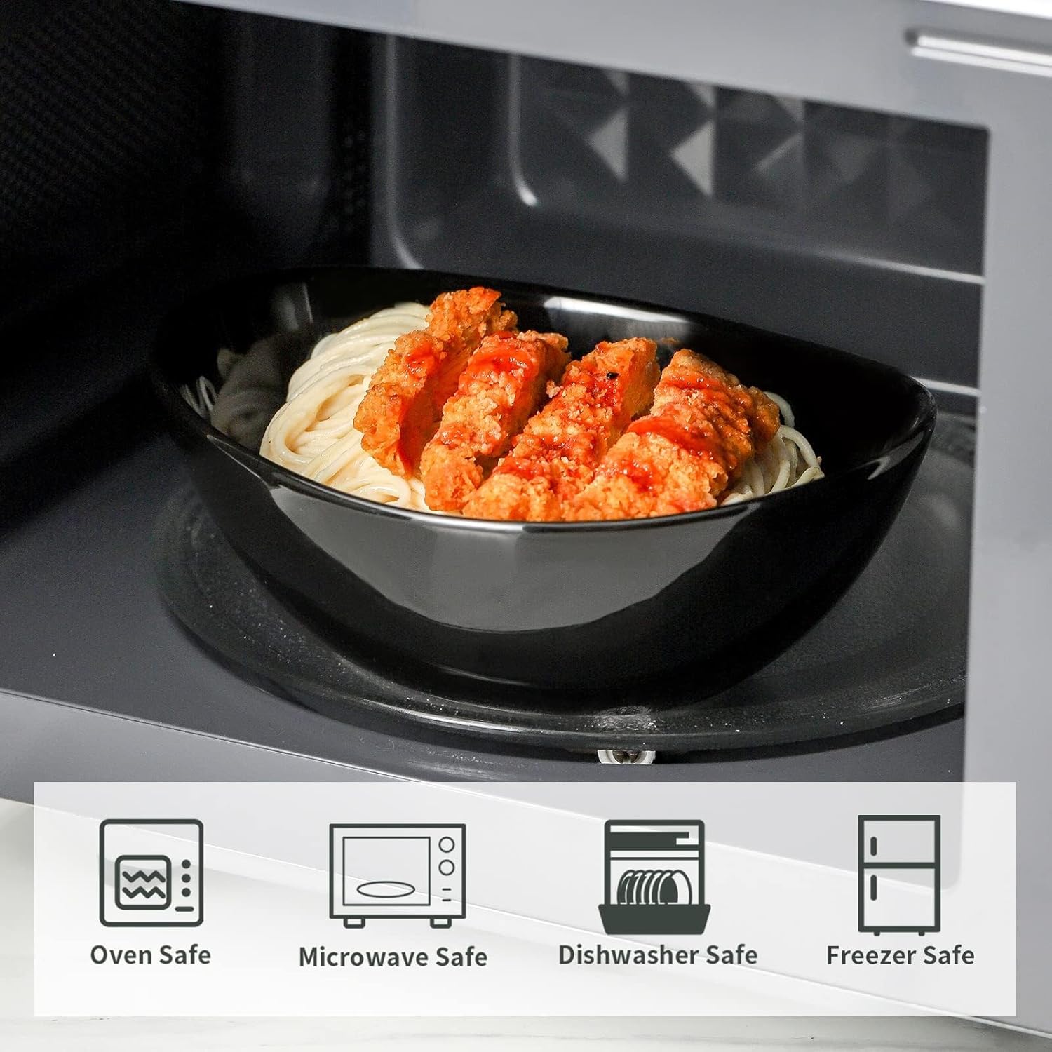 • MODERN DESIGN:With a stylish, curved shape and chic black finish, this bowl set brings a modern, sophisticated touch to your table. The deep design not only looks elegant but also keeps food contained nicely, whether you’re serving a hearty pasta dish or a comforting soup