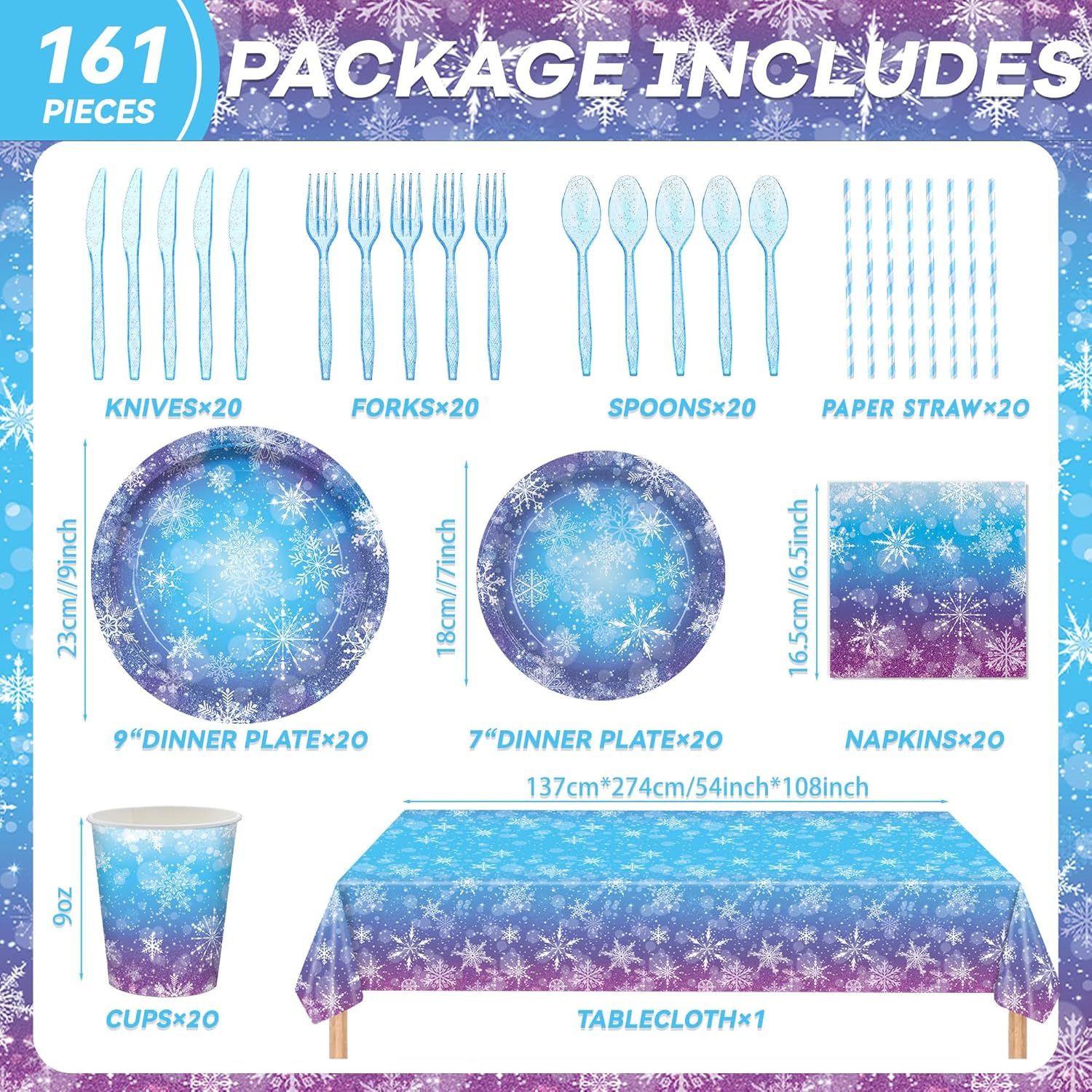 Magical Frozen Wonderland Party Dinnerware Kit - 161 Blue Purple Winter Snowflake Birthday Supplies Decor for Kids - Premium Dinner&Dessert Plates Cutlery Napkins Straws Cups Tablecloth for 20 Guests