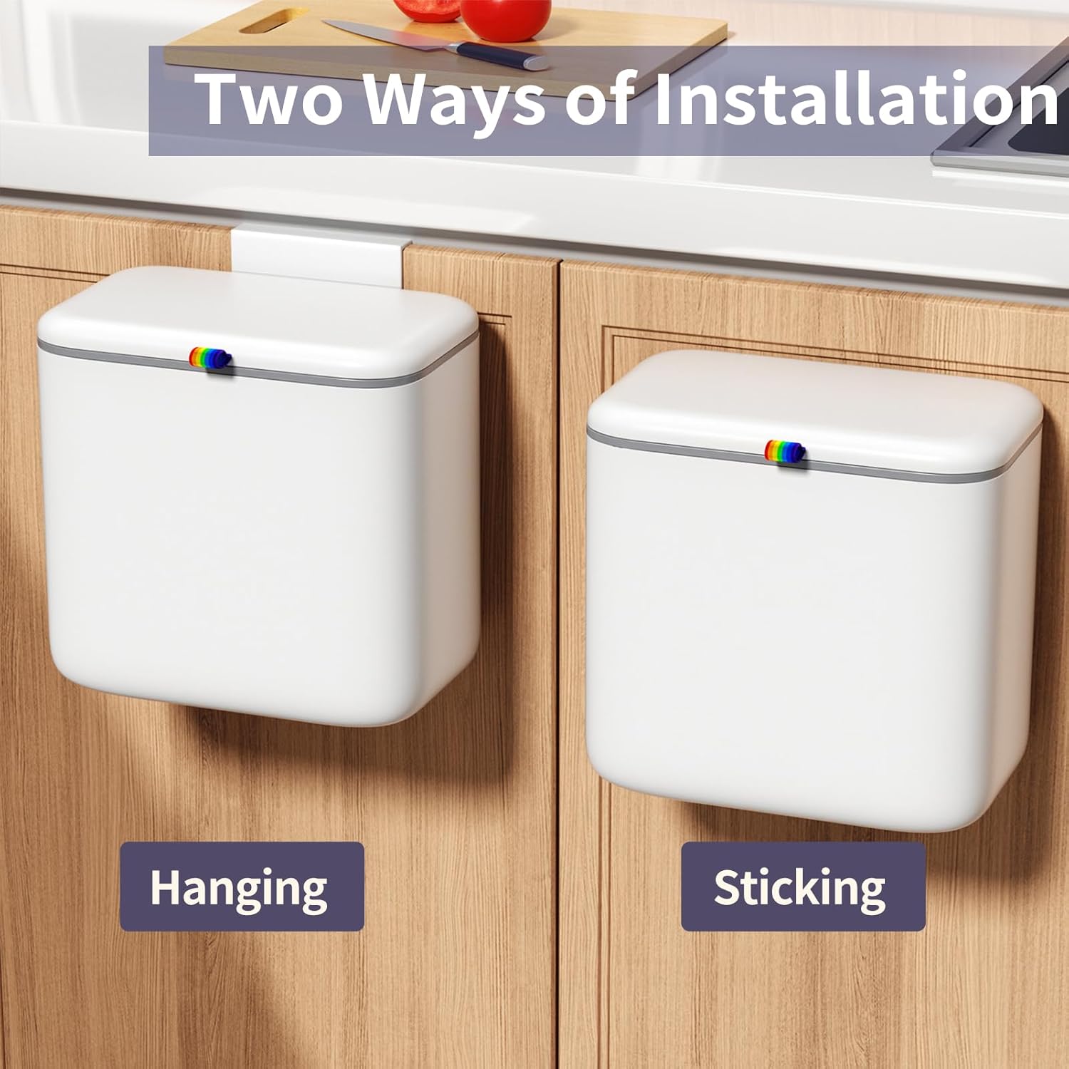 • 【Hanging/Wall-Mounted Trash Can】This compost bin comes with a hook and an adhesive hook. You can use the hook to hang it directly on the kitchen cabinet door (door thickness less than 1 inch), or use the adhesive hook to stick it on any smooth and clean vertical surface, such as the bathroom wall.