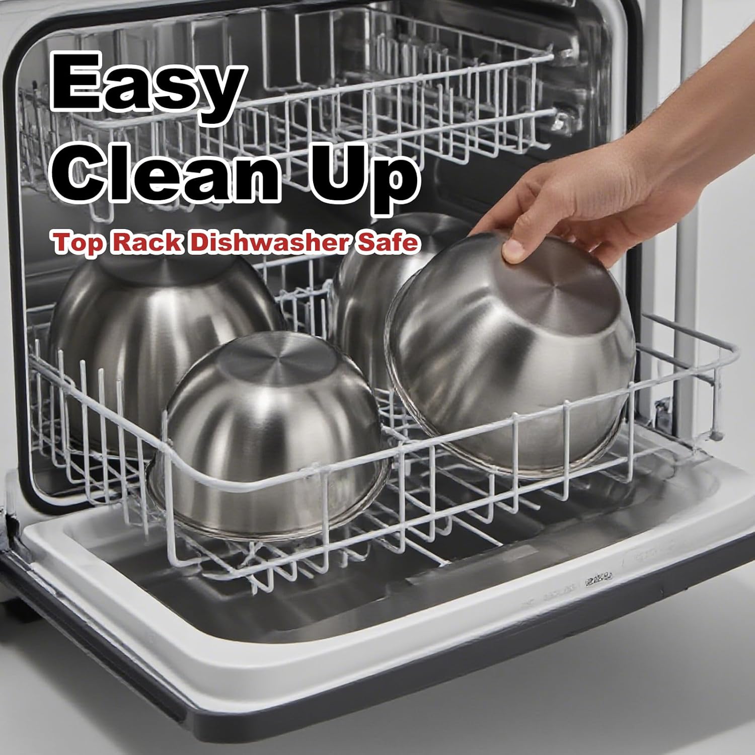 • [PREMIUM 304 STAINLESS STEEL BOWLS – FOOD SAFE & DURABLE] Crafted with food-grade 304 stainless steel featuring a mirror-polished, non-porous interior that resists stains and odors. Unlike plastic alternatives, these bowls are warp-resistant and dishwasher-safe for easy cleaning, ideal for baking, salads, and meal preparation