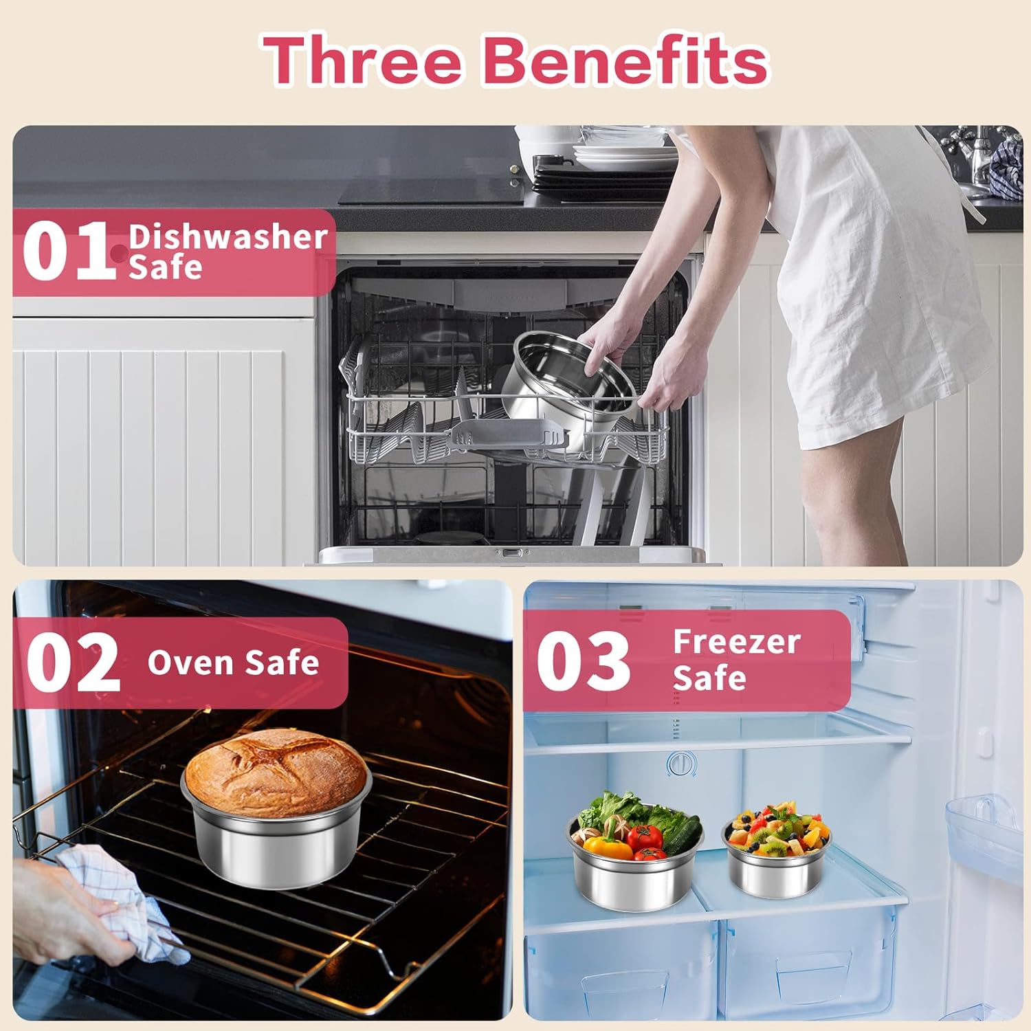 • Round Nesting Design Salad Container: Our condiment containers with lids is made of 304 stainless steel and silicone lids, BPA-free, oven and freezer safe. Both the containers and lids are dishwasher-safe, making cleanup a breeze