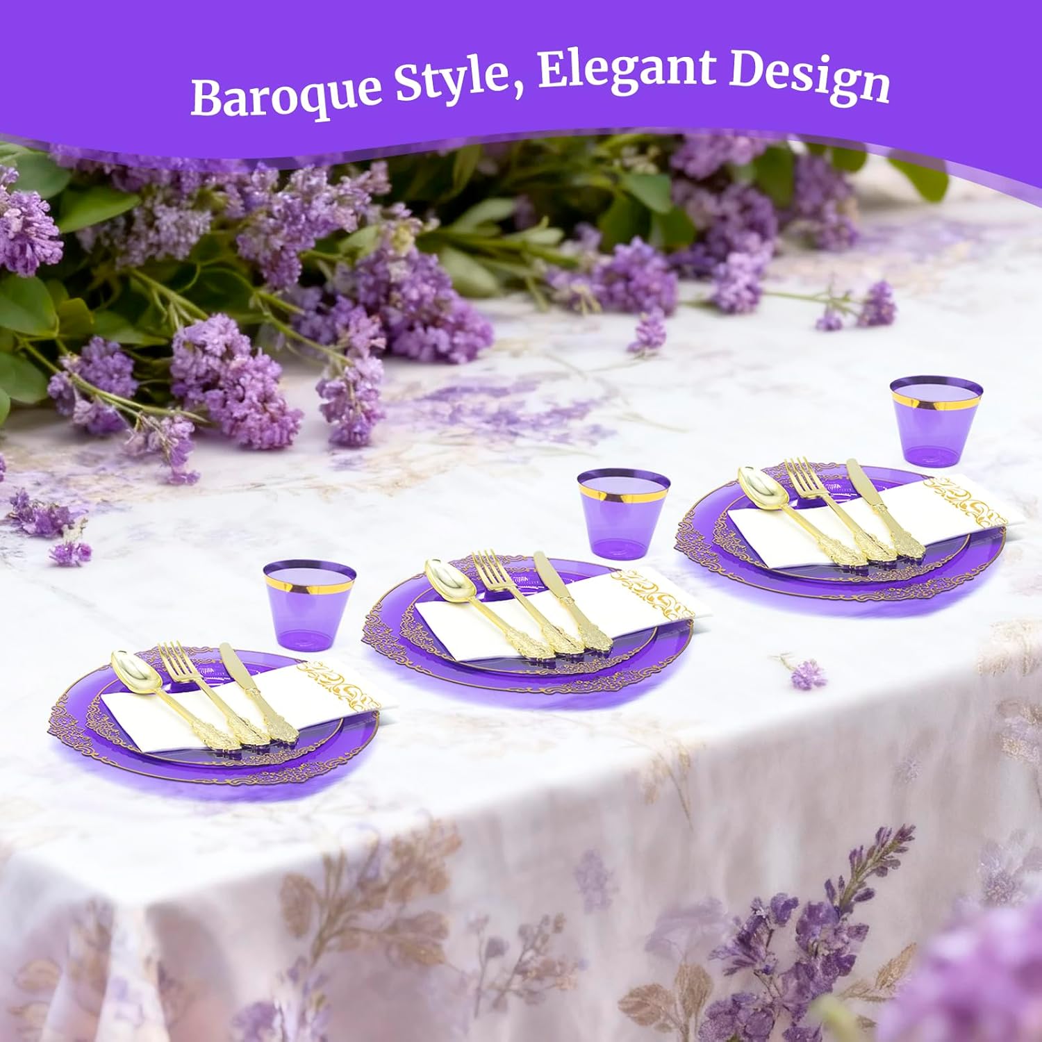 AIRE 175PCS Purple Gold Plastic Plates for Party Dinnerware Sets for 25 Guests, Vintage Disposable Plastic Party Plates Cups Spoons Forks Knives Napkins for Wedding Birthday Christmas BBQ Parties