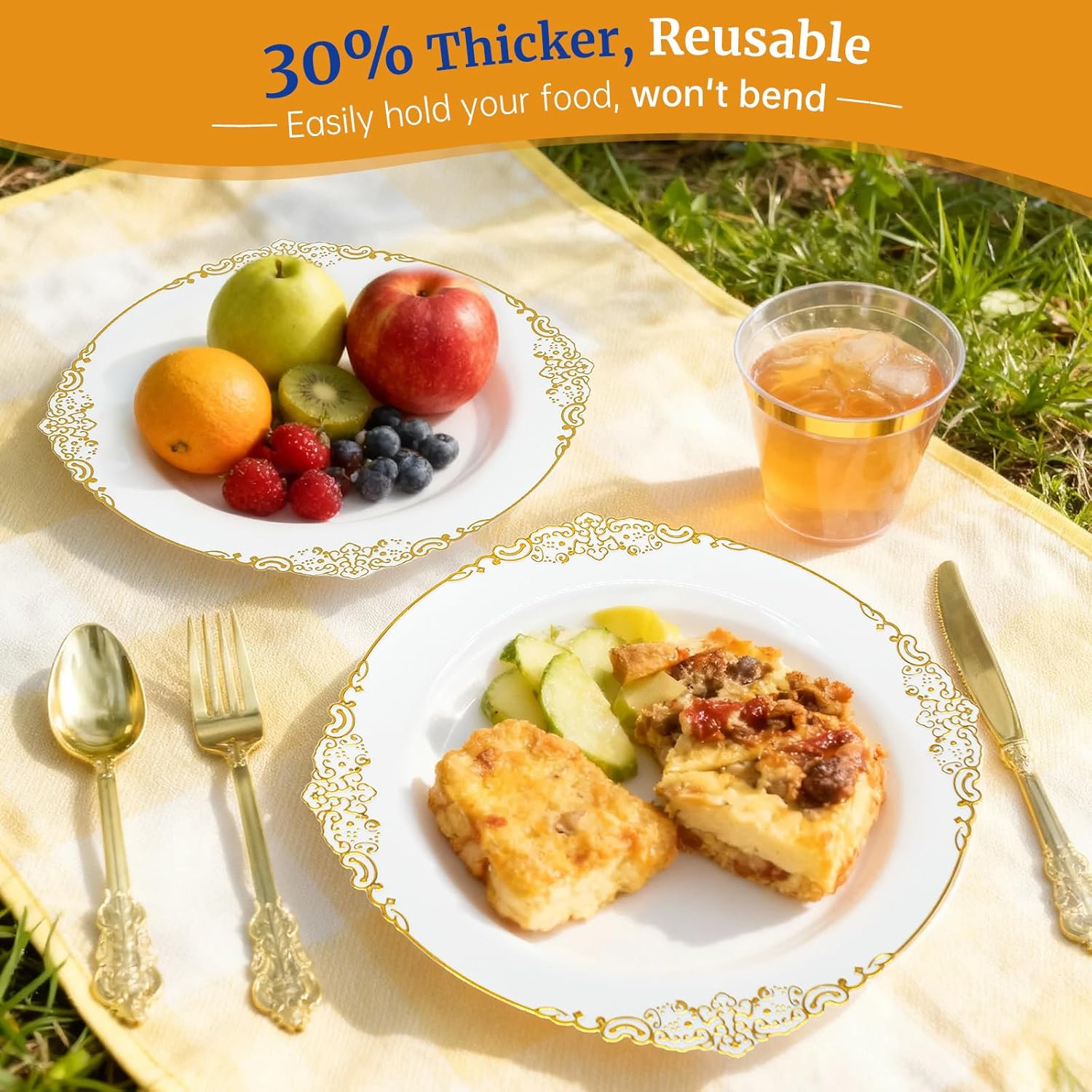 • 50 Guests Value Pack. Our vintage white and gold plastic plates set include 50 10.25'' dinner plates, 50 7.25'' dessert plates, 50 gold plastic knives, forks and spoons, 50 9 OZ cups and 50 napkins, an ideal choice for holidays or family gatherings, and a perfect addition to party decorations