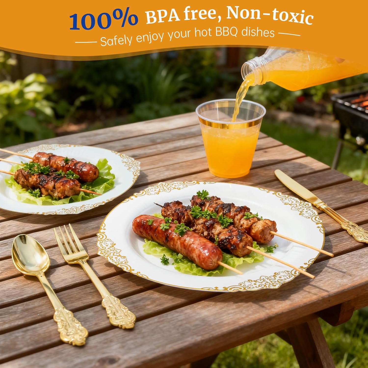 AIRE 350PCS Gold Plastic Plates for Party Supplies Dinnerware Sets for 50 Guests, Vintage Disposable Plastic Party Plates Cups Spoons Forks Knives Napkins for Wedding Birthday Christmas BBQ Parties