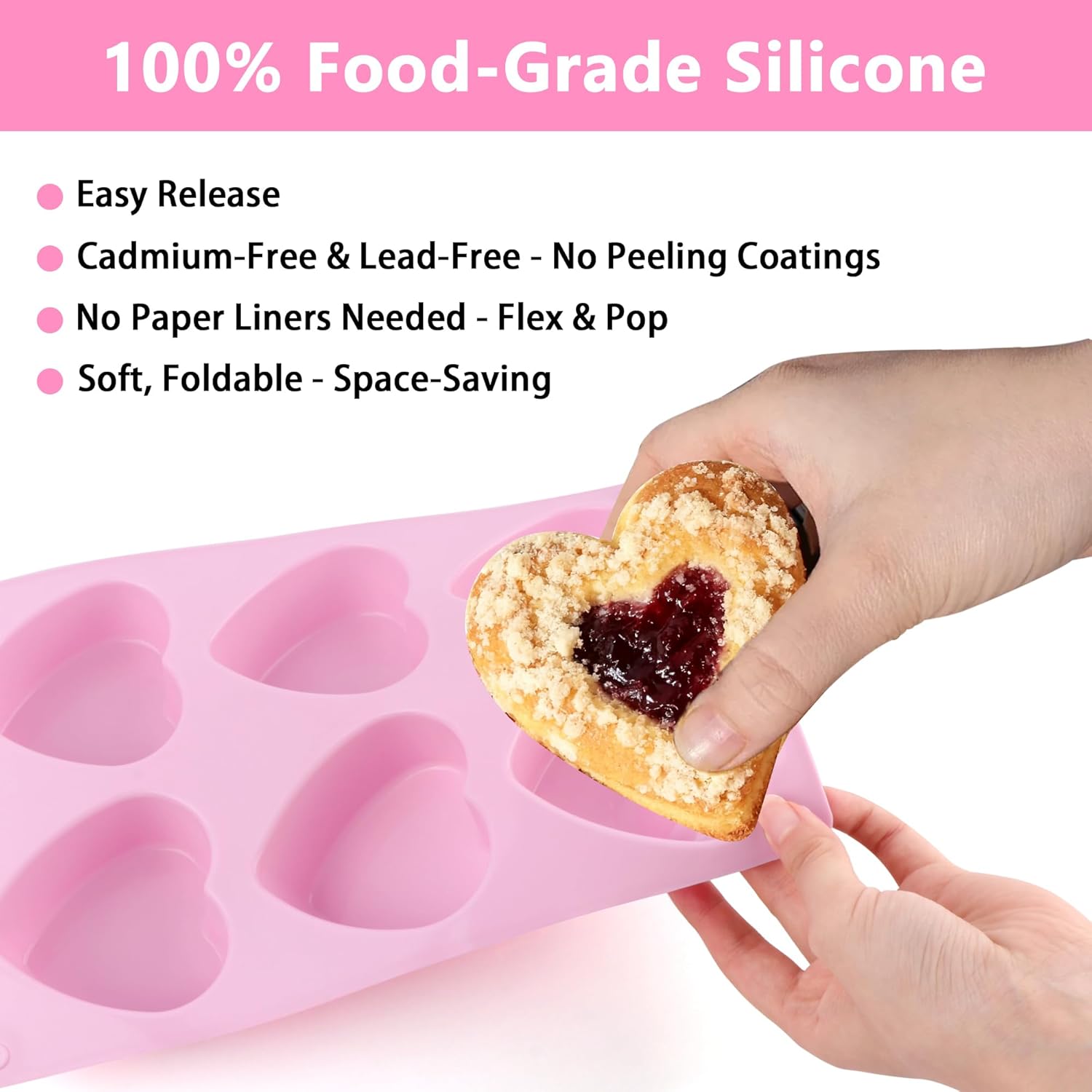 3-Pack 6-Cup Silicone Muffin Pans, Nonstick Cupcake Baking Molds, BPA/PFA-Free, Dishwasher & Oven Safe Heart-shaped Pink