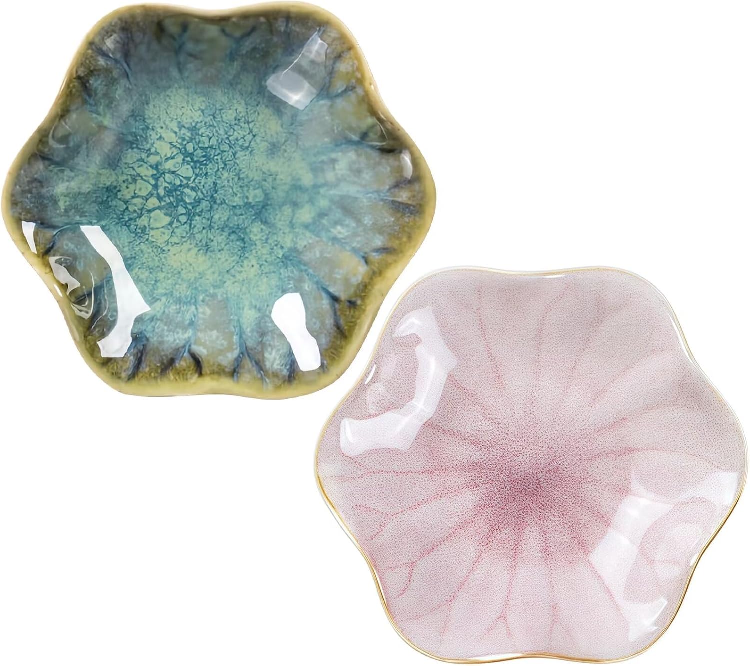2Pcs Ceramic Jewelry Dish - Lotus Leaf Shape, for Ring Holder Necklace Small Key, Suitable for Mother Friend Sister, Gifts for Women, Cute Plate Trinket Tray, Home Decor (Crystal Green & Pink)