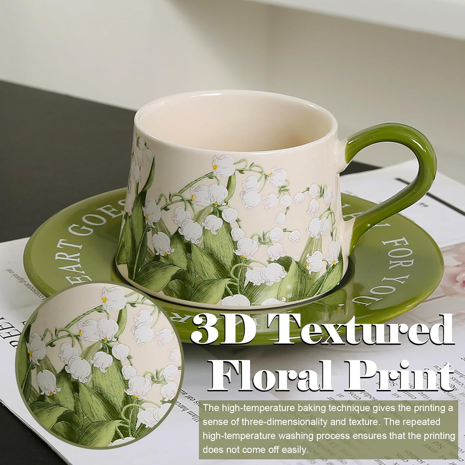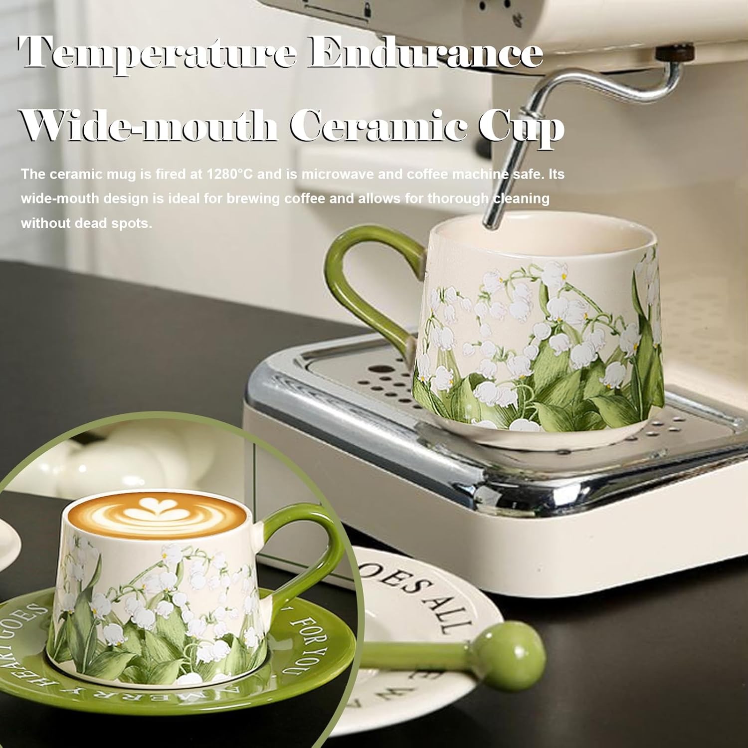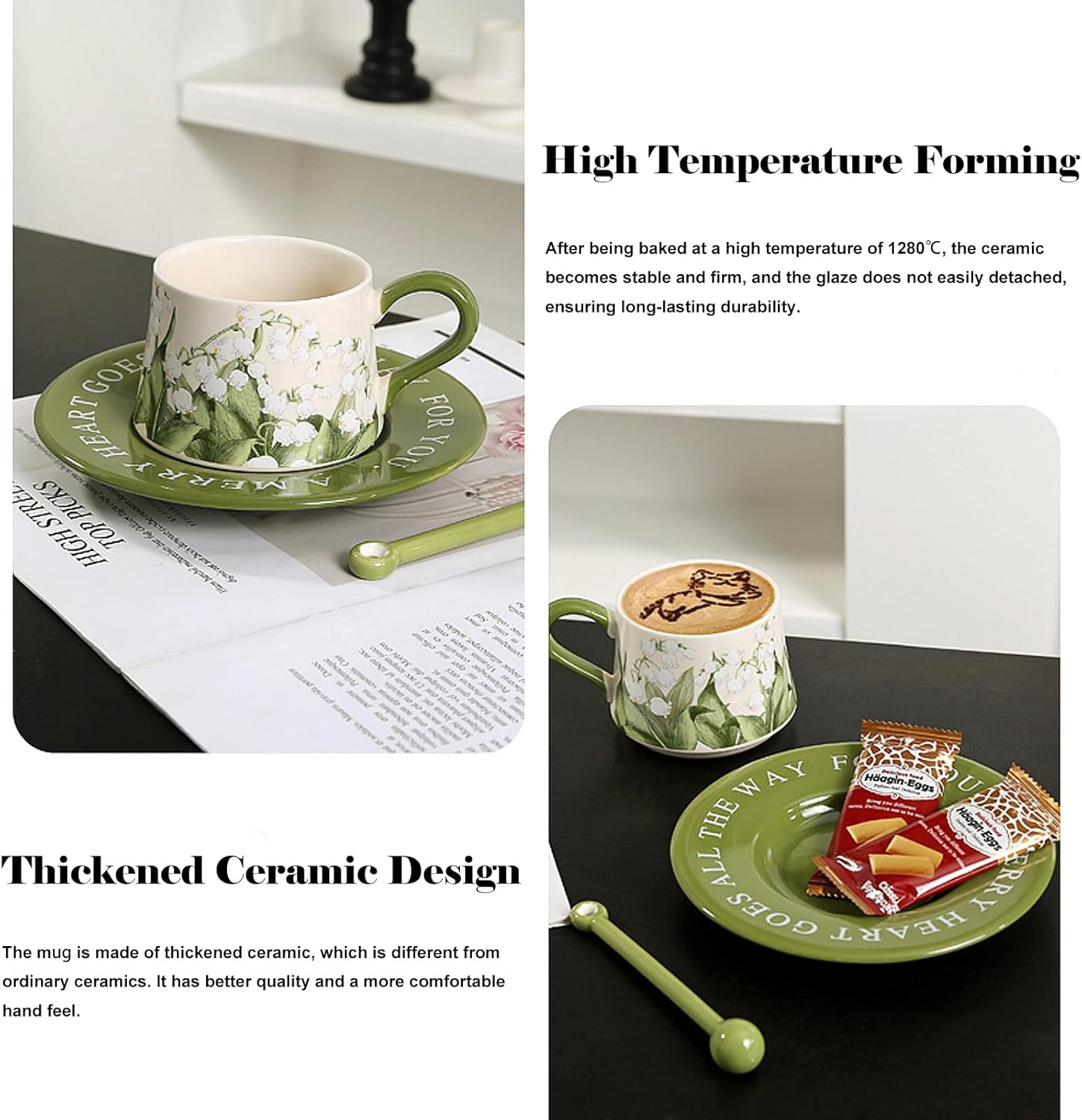 • 【Exquisite Floral Elements】The coffee mug set features a color scheme of green and cream color. The cup body is printed with large patches of vivid lily of the valley. The pure white bell-shaped flowers and sword-shaped green leaves complement each other, adding a touch of natural charm and vitality, resembling a work of art.