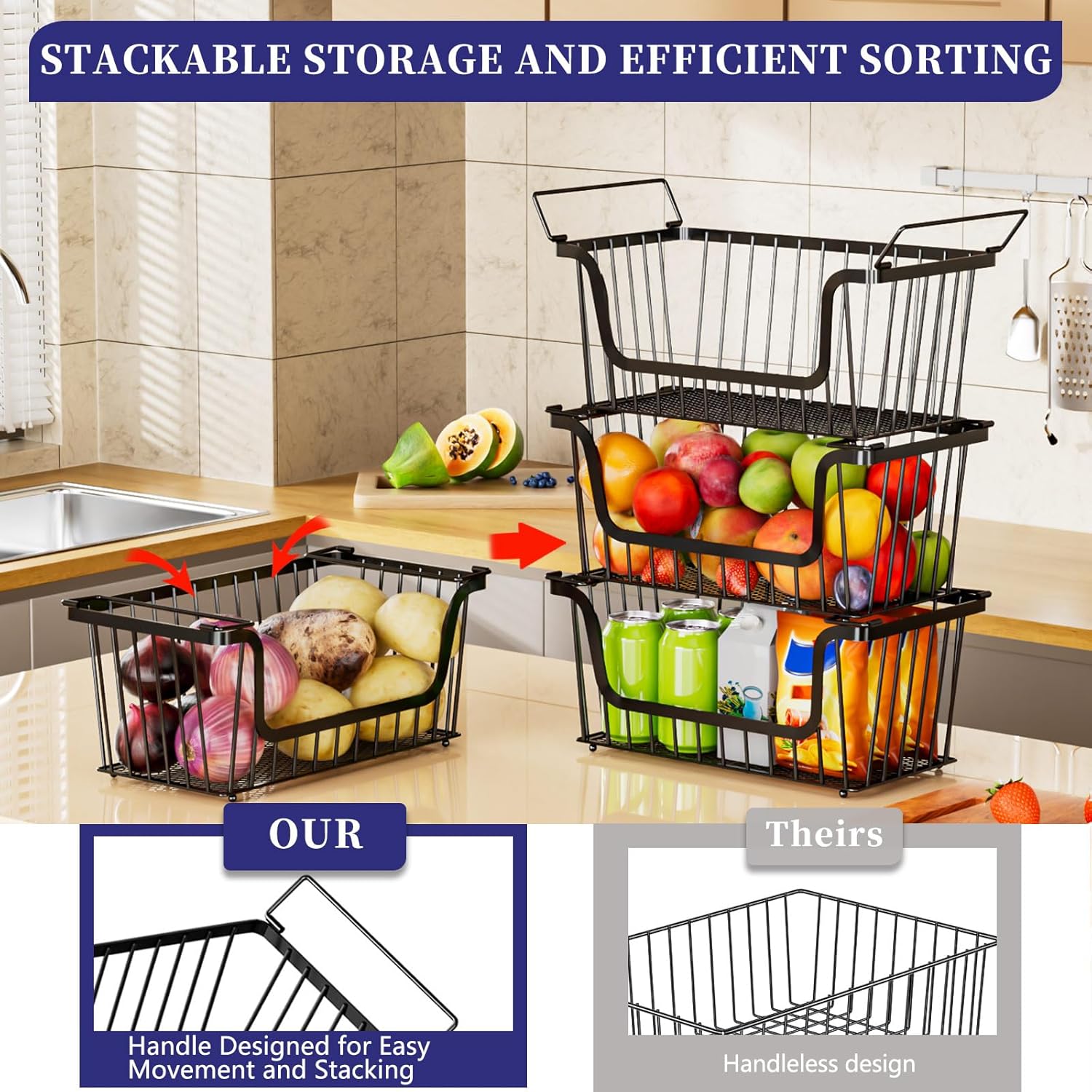• MULTIFUNCTIONAL - STORAGE SPACE INCREASED BY 50%: The U-shaped stackable design shelf baskets is carefully crafted from thickened and reinforced high-quality metal. Whether it's for kitchen countertop storage or pantry organizers and storage, fruit basket,storage shelves, garage shelving, wire shelving can effectively utilize the vertical space for 50% more storage.