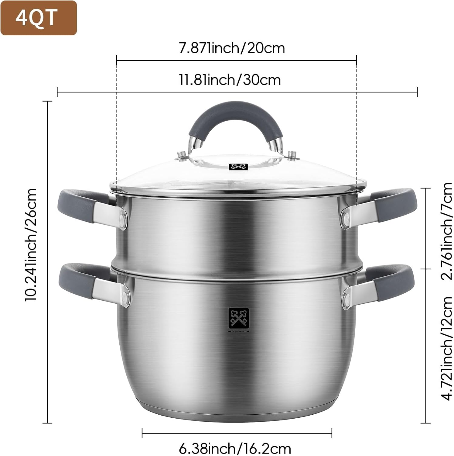 • Steamer Stockpot Set: Set includes 3 pieces: a 4QT stockpot (Ø 7.8" x 4.72"H), a 2QT steamer (Ø 7.8" x 2.75"H), and a clear tempered glass lid. Ideal for family cooking (3-5 people).