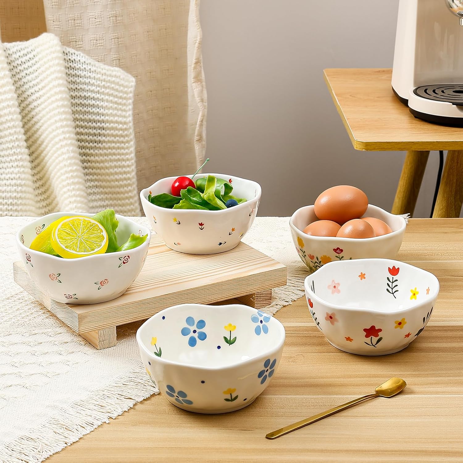 Koythin Ceramic Cereal Bowl, Cute Flowers Pattern Kitchen Bowls for Cereal, Salad, Pasta, Soup, Dessert, Serving, Home Decor, Microwave and Dishwasher Safe (Pink Flowers and Cherry)
