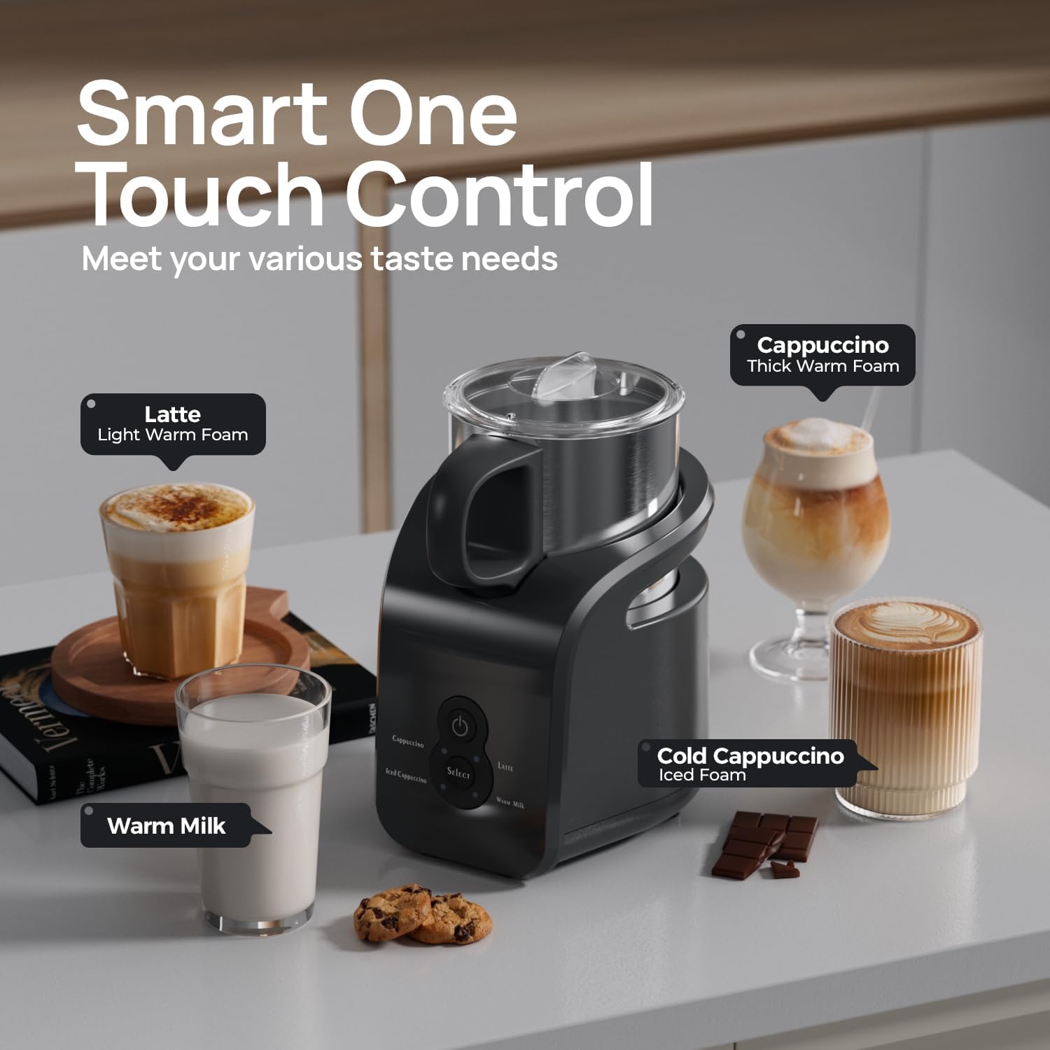 • One-Touch Operation & Auto Shut-Off: Select your desired mode and press start. The intuitive LED indicator guides you, and it turns off automatically when done—no over-frothing or burning.