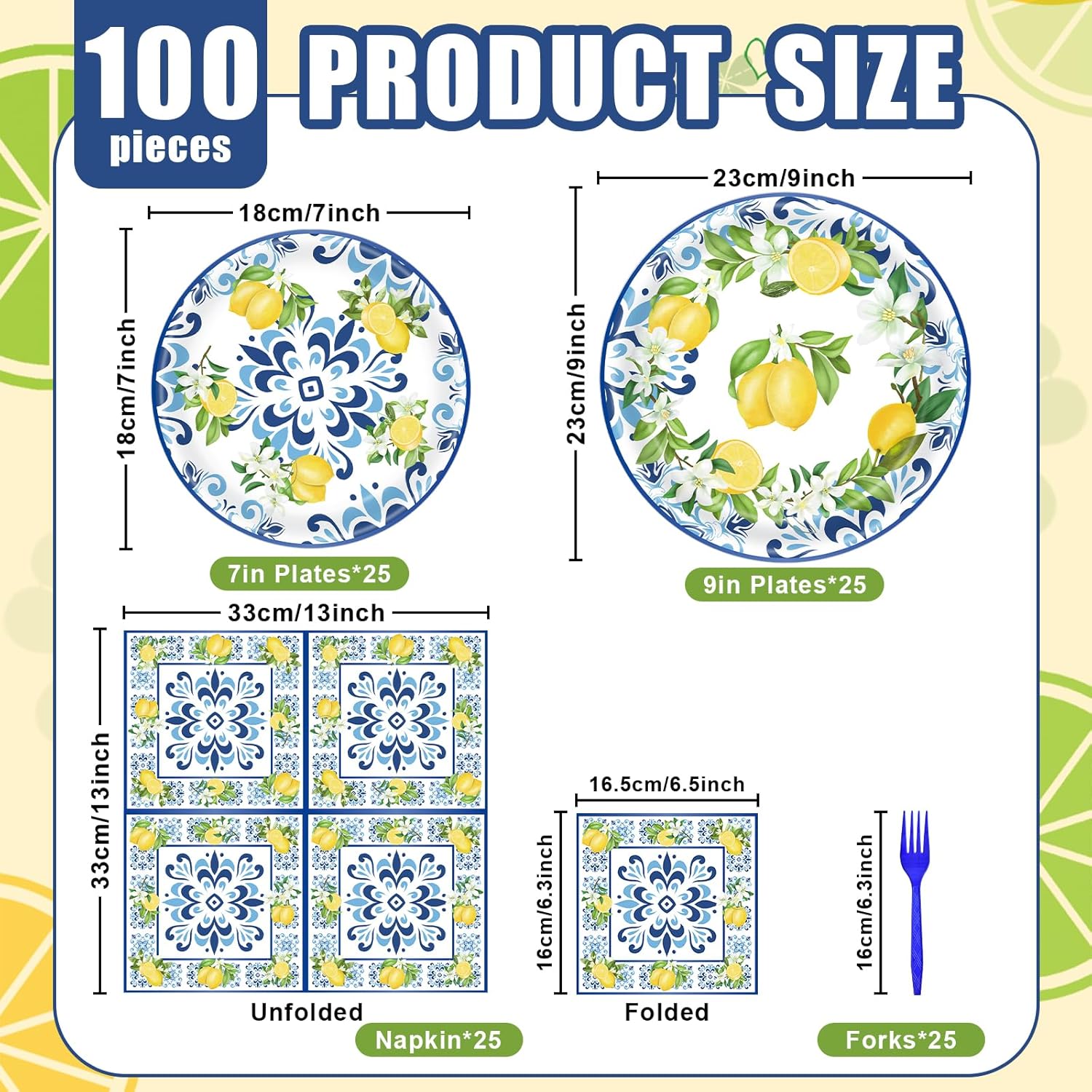 100 Pcs Lemon Tableware Party Supplies – Citrus Theme Blue Tile Disposable Plates, Napkins, and Blue Forks for Summer Parties, Picnics, BBQ, Brunch, Weddings, Birthdays, and Baby Showers – Serves 25