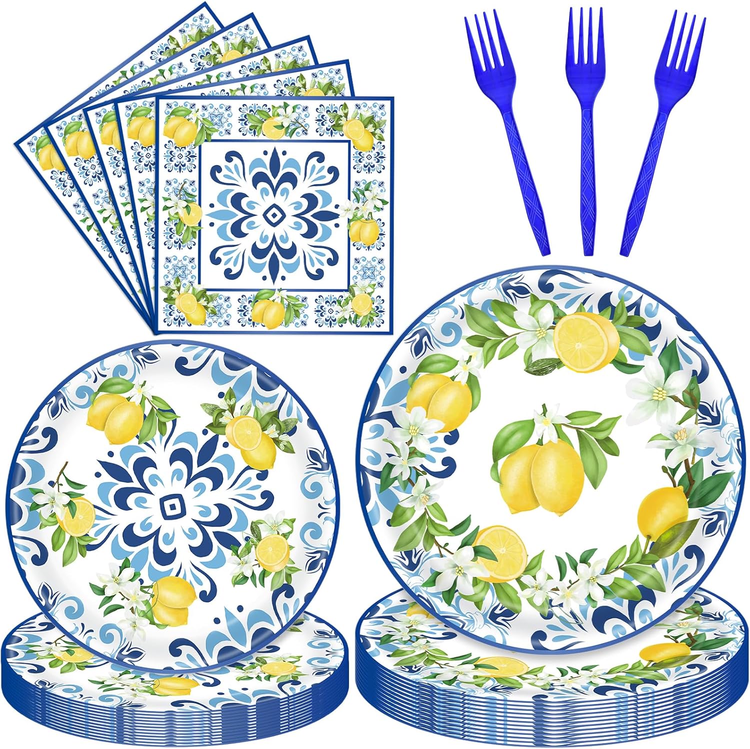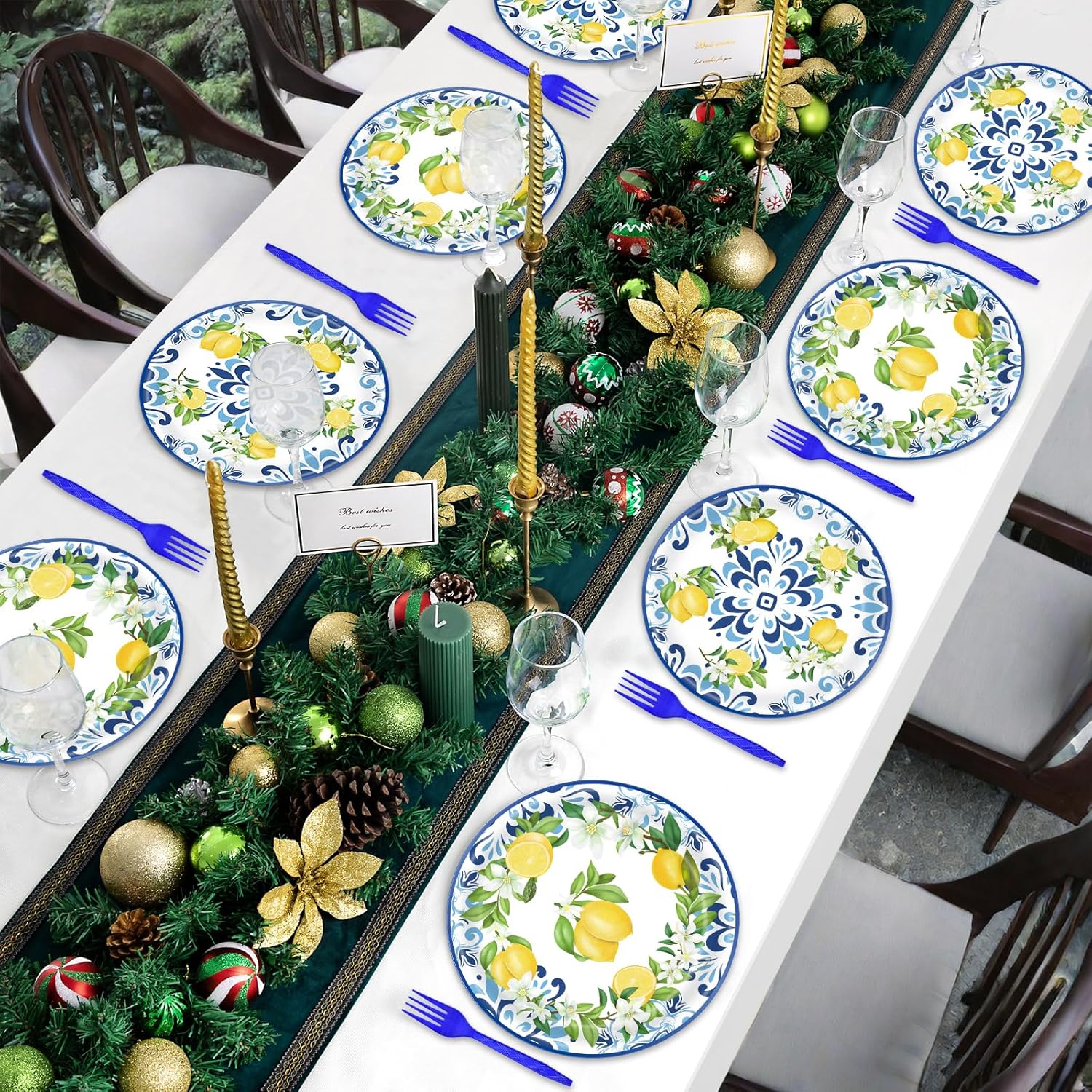 • Mediterranean Citrus Design– Each piece features bright yellow lemons, lush green leaves, white blossoms, and blue tile accents, reminiscent ofAmalfi Coast party decorationsfor a fresh and inviting summer atmosphere.