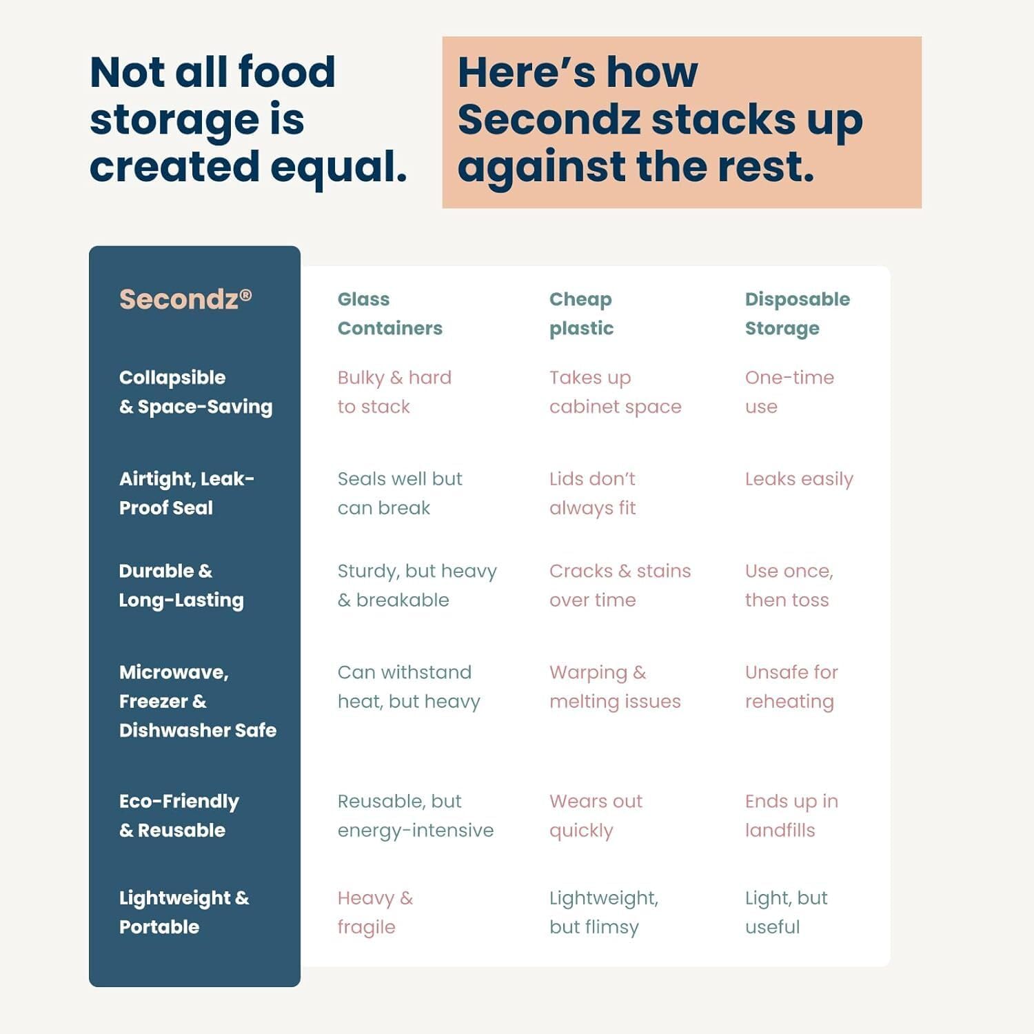 • PREMIUM BPA-FREE SILICONE: Made from high-quality, food-safe silicone, Secondz is durable, flexible, and built to last. Free from harmful chemicals, these containers keep your food safe and fresh, meal after meal.