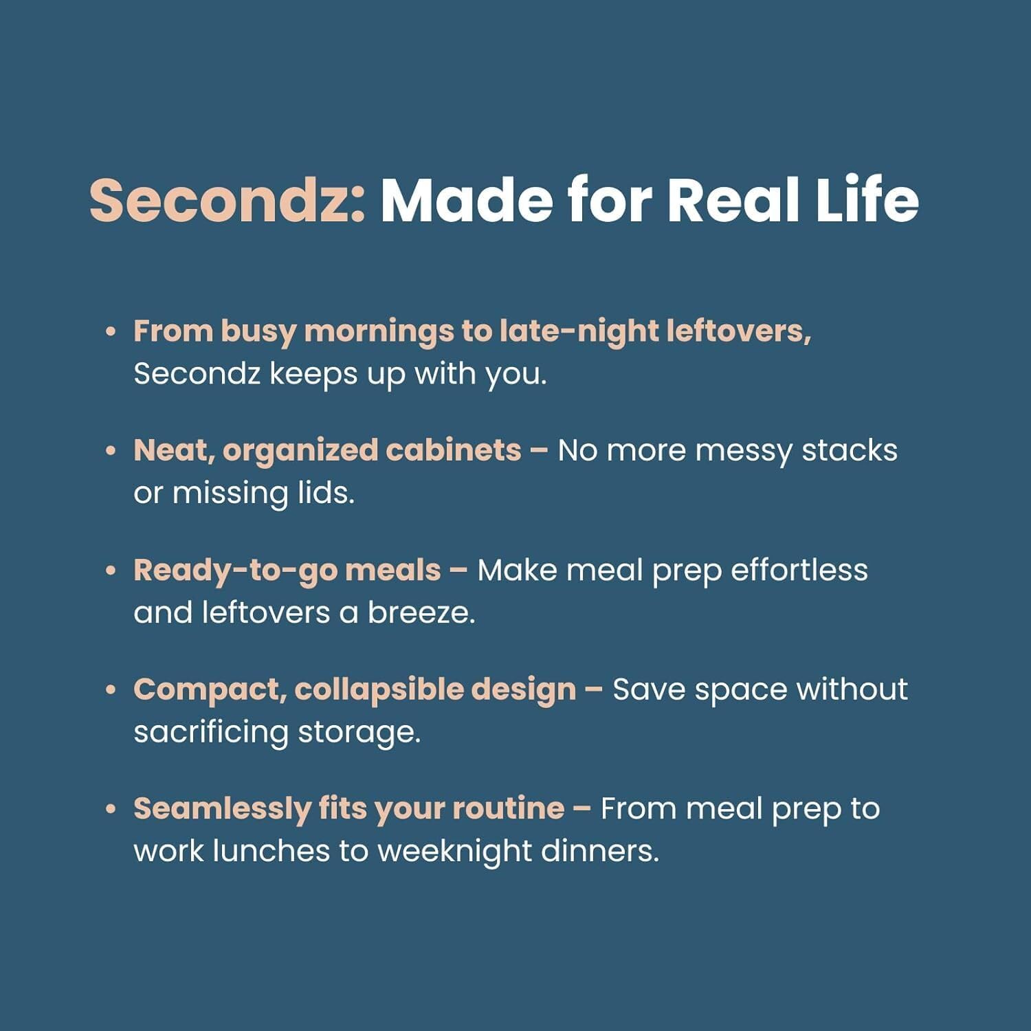 • PERFECT FOR MEAL PREP & LEFTOVERS: Portion out meals for the week or store last night’s dinner without the mess. Secondz features airtight, leakproof lids that lock in freshness and prevent spills, so you can take your meals anywhere.