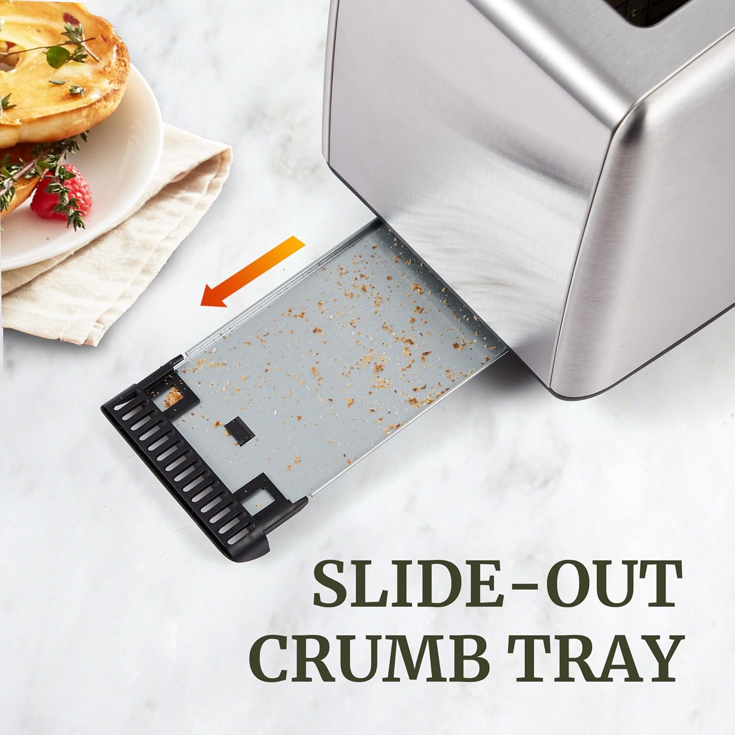 • MODERN STAINLESS-STEEL DESIGN WITH CRUMB TRAY Built with a durable stainless-steel exterior for a sleek, contemporary look. The full-width crumb tray slides out for easy cleanup, keeping your kitchen tidy and your toaster performing at its best.