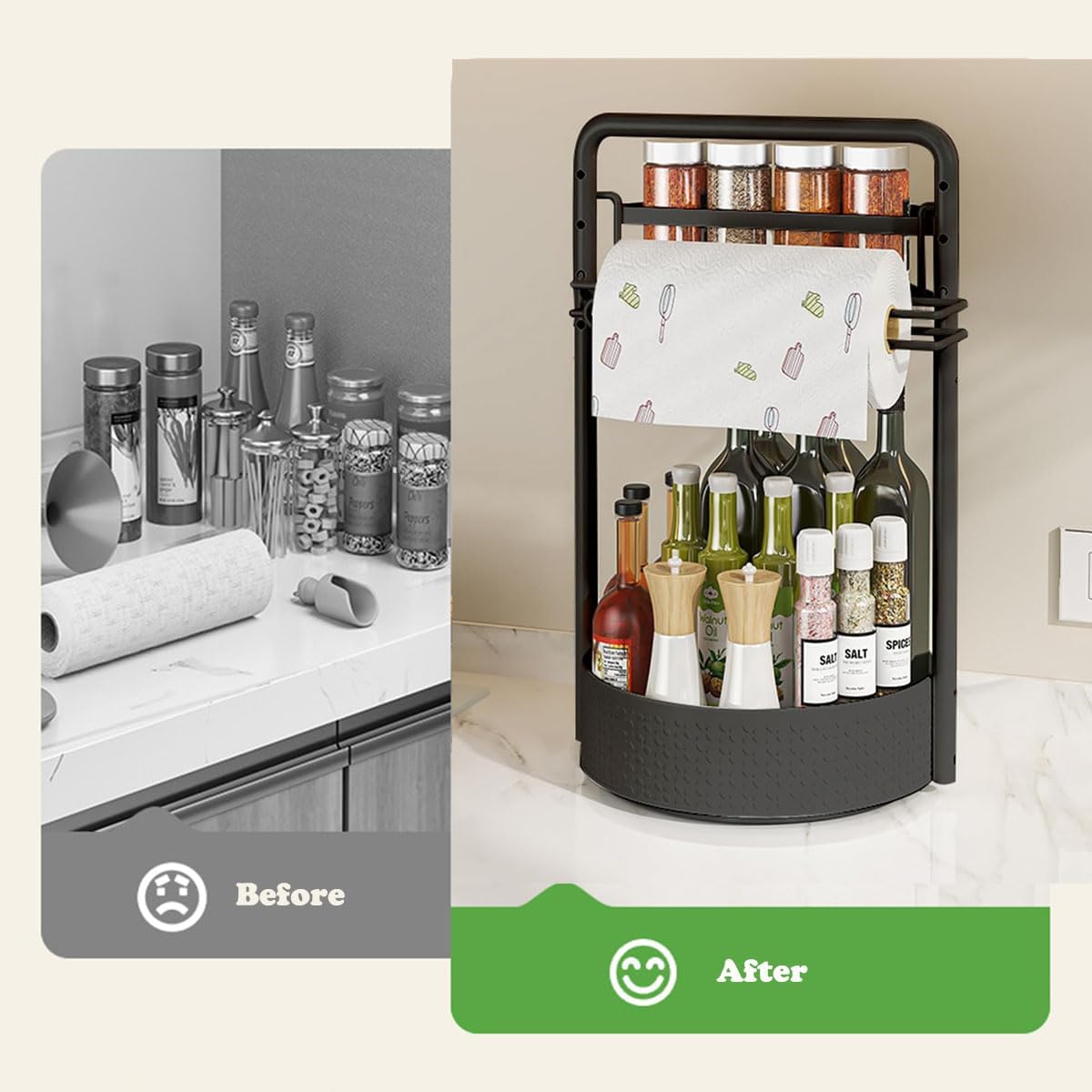 Lazy Susan Organizer, 360° Rotating Metal Spice Rack with Paper Towel Holder, Turntable Spice Holder for Condiments, Bottles, Jars, Suit for Kitchen Countertop & Cabinet, Black