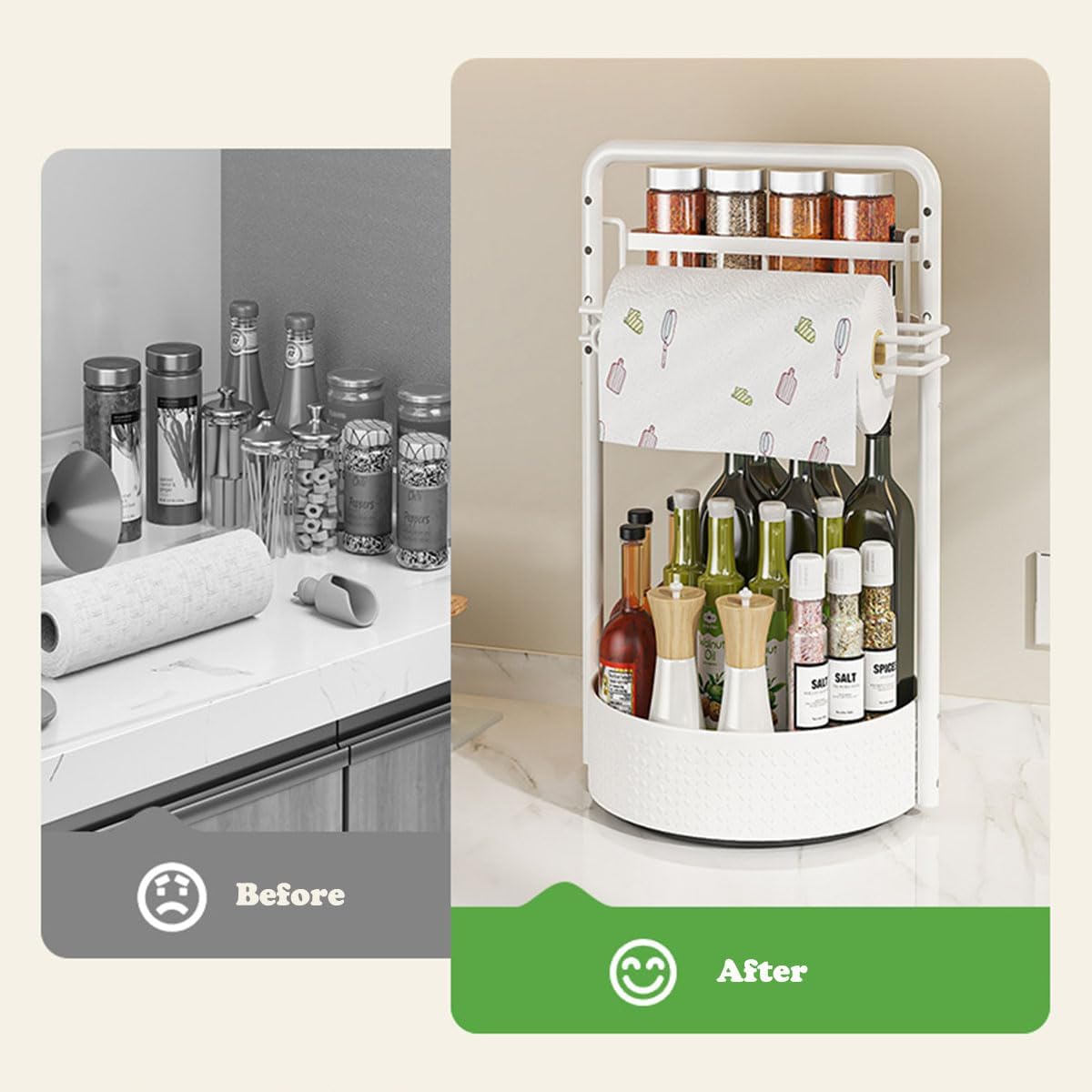 Lazy Susan Organizer, 360° Rotating Metal Spice Rack with Paper Towel Holder, Turntable Spice Holder for Condiments, Bottles, Jars, Suit for Kitchen Countertop & Cabinet, White