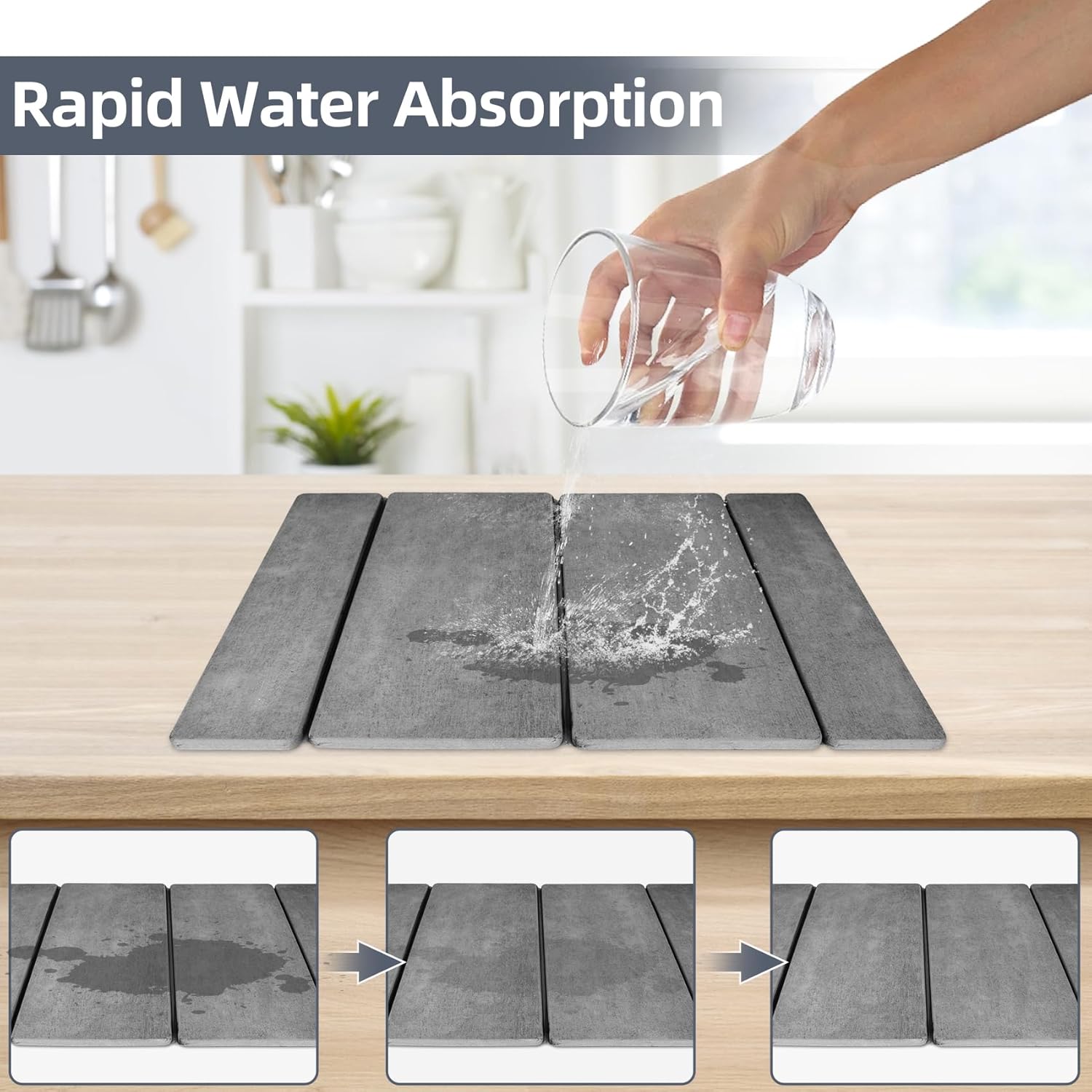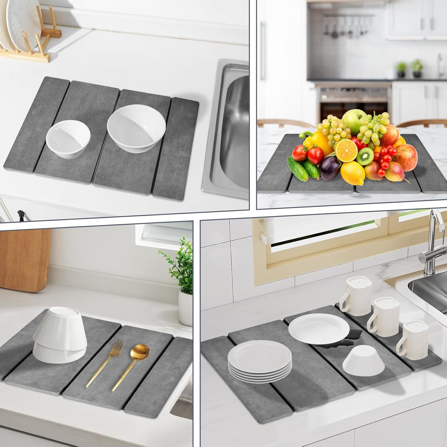 Stone Dish Drying Mat for Kitchen Counter,24x16 Collapsible Diatomaceous Earth Mats, Quick Drying Absorbent Dish Mat,Non-Slip Countertop & Bath Mat for Dishes Cups Bottles,Dark Gray