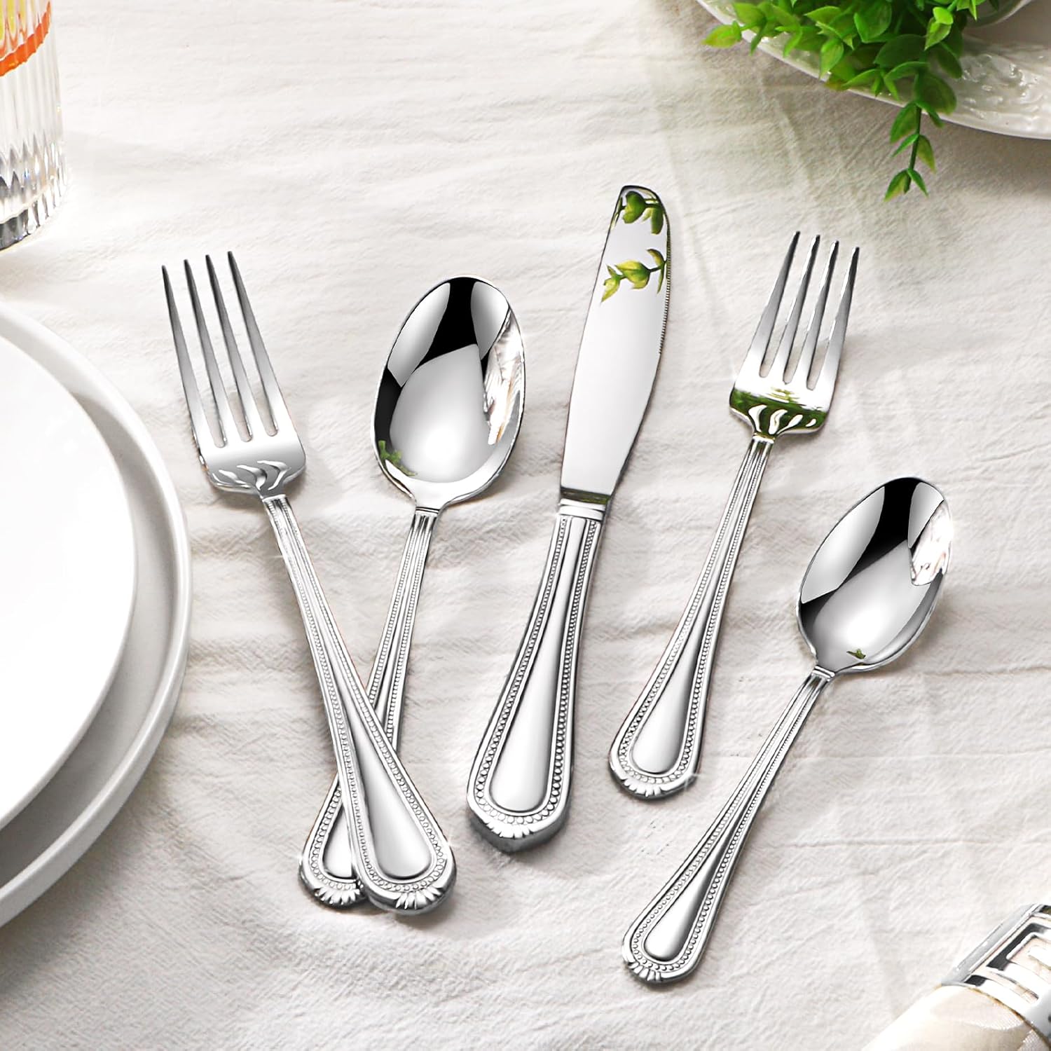 • 60-Piece Service for 12 with Luxury Storage: This complete silverware set includes everything needed for elegant entertaining: Four five-piece place settings (Dinner fork, Salad fork, knife, Dinner Spoon, Teaspoon), plus a serving spoon, all packaged in a delicate box. The organizer protects your investment and keeps your flatware neatly stored and drawer-ready.