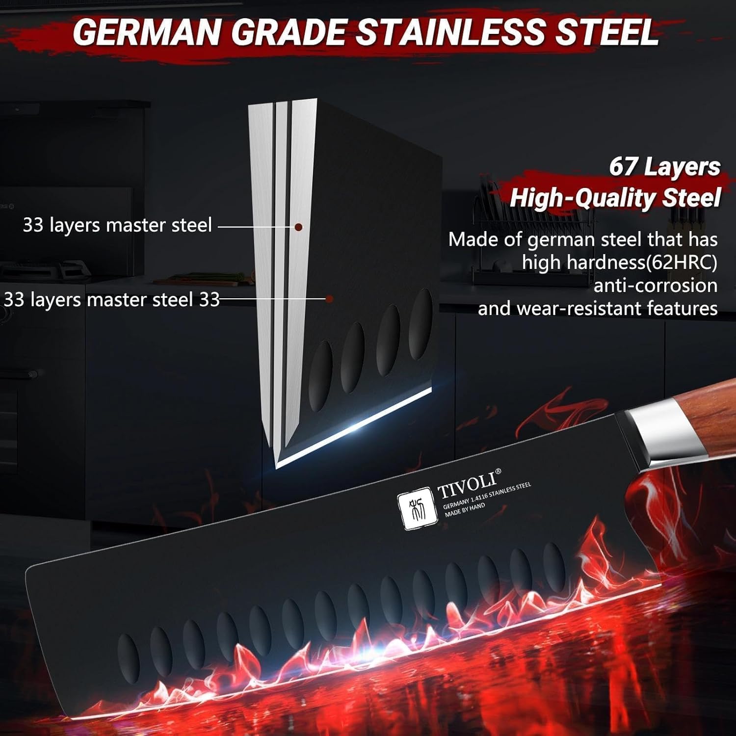 • STAIN-RESISTANT AND EASY TO CLEAN — TIVOLI deep cooking knife set deliver superior resistance to rust, corrosion, and stains. This advanced material ensures an optimal balance of exceptional edge retention and structural durability. To preserve good knife for cooking precision and longevity, we recommend hand washing with a mild detergent immediately after use and gently drying with a soft cloth